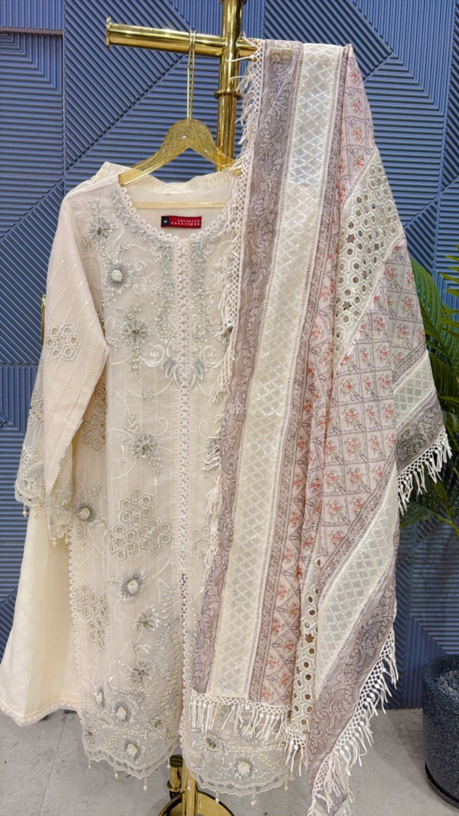 This BEAUTIFUL 3 PIECE SET (kurta length 43 ,bottom 41) is perfect for the season . The 3 PCS SUIT beautifully to create a versatile and stylish outfit. your summer wardrobe with this luxurious addition, adding a touch of sparkle and charm to any occasion .