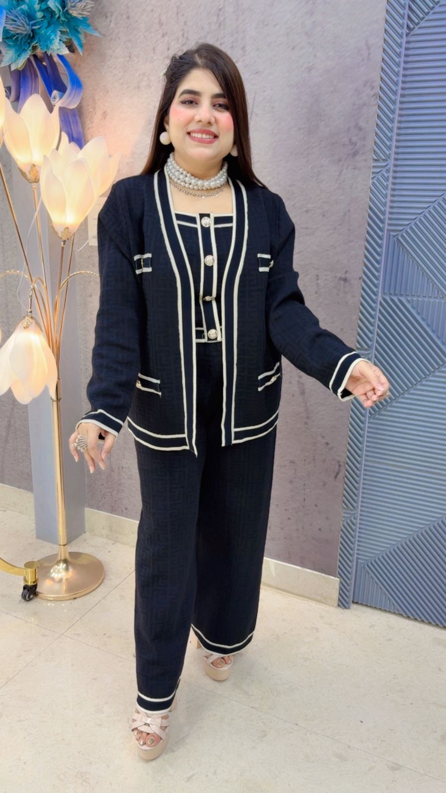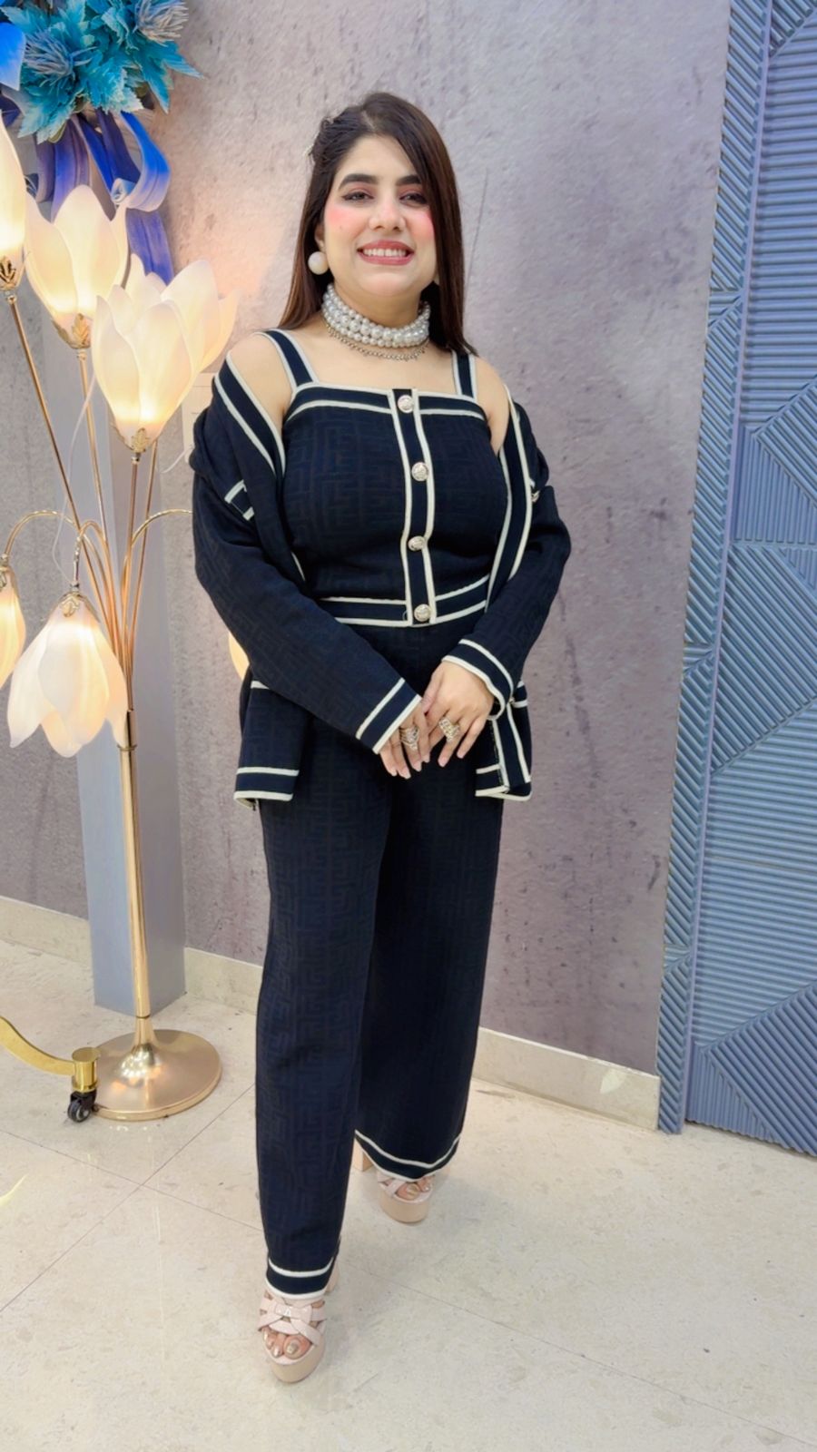 This BEAUTIFUL 3 PIECE CORD SET (TOP LENGTH-23-24, BOTTOM-39-40, INNER-14-15) Approx is perfect for the season . The CORD SET beautifully to create a versatile and stylish outfit. your wardrobe with this luxurious addition, adding a touch of sparkle and charm to any occasion. ( DELIVERY DAYS WITHIN: 10-12 DAYS)