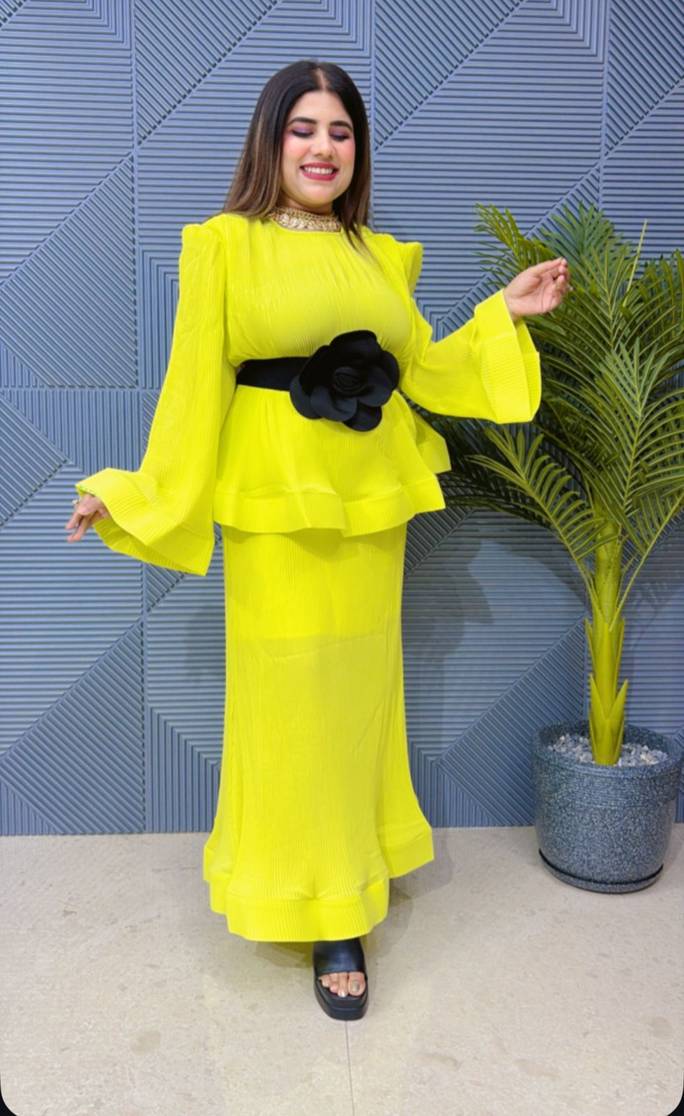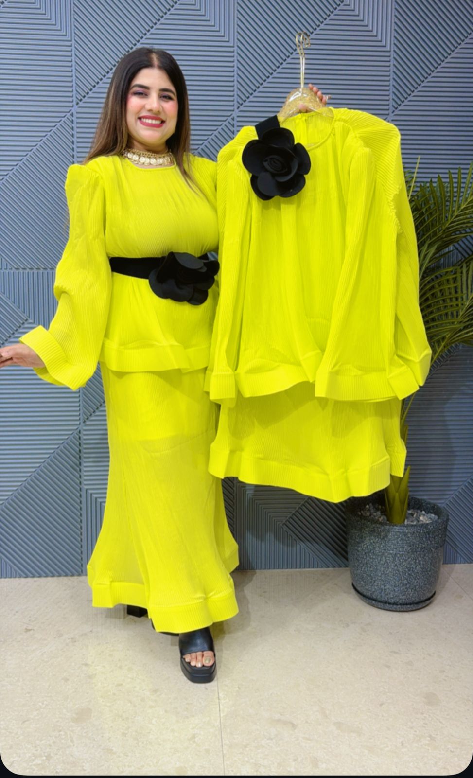 This beautiful Co-Ord set, named Beautiful pleated Co-Ord Set, is the perfect addition to your wardrobe. Made with intricate cut work, it offers a beautiful and unique design. Elevate your style with this versatile and eye-catching set.