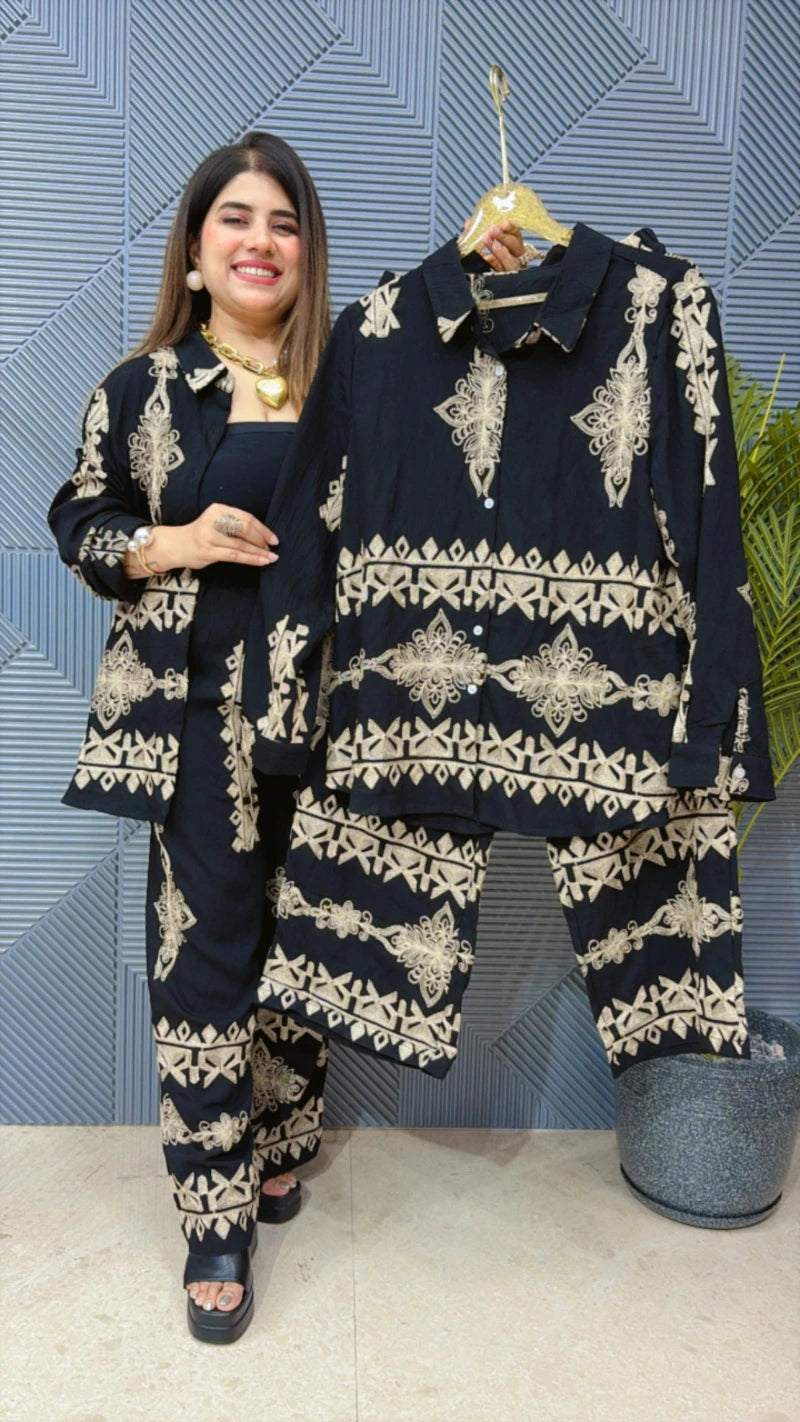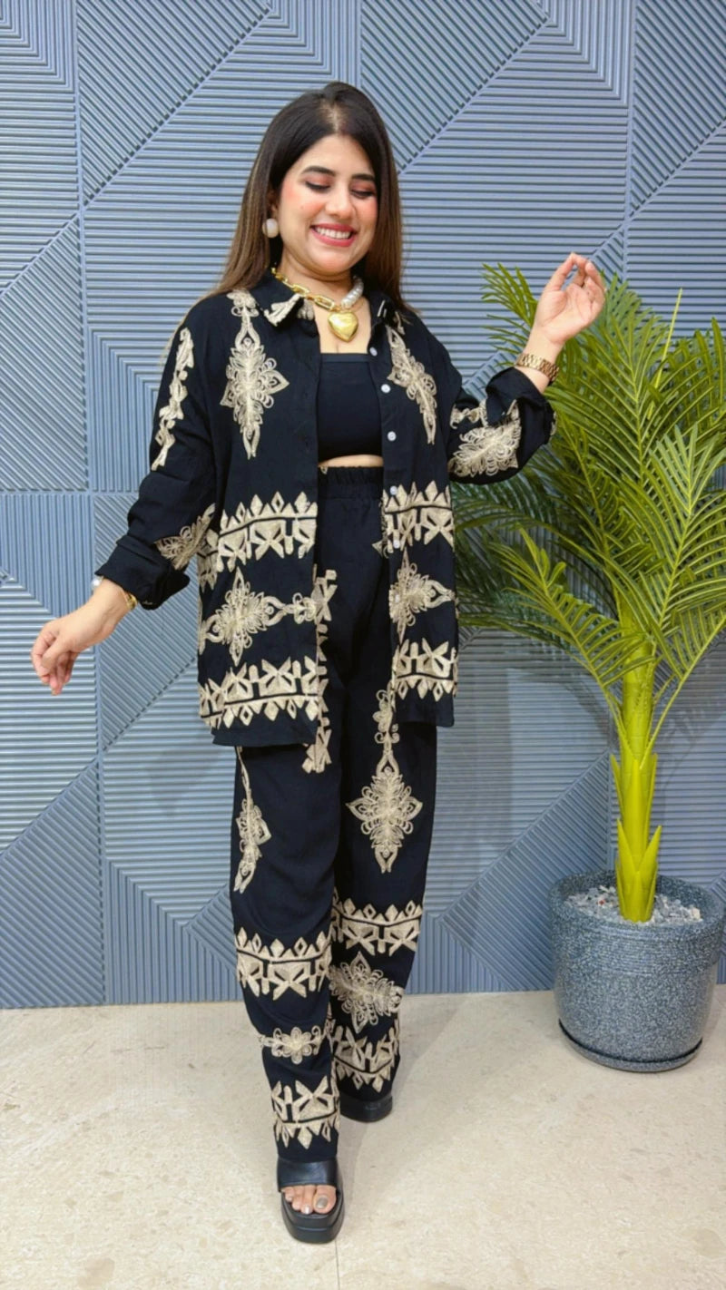 This beautiful cordset is perfect for the season . The top and bottom co-ordinate beautifully to create a versatile and stylish outfit. Elevate your summer wardrobe with this luxurious addition, adding a touch of sparkle and charm to any occasion