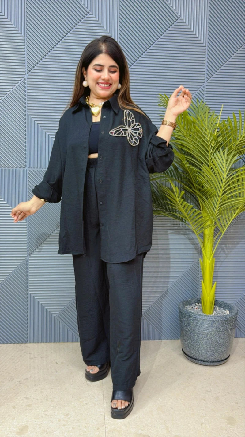 This beautiful cord set is perfect for the season . The shirt and bottom co-ordinate beautifully to create a versatile and stylish outfit. Elevate your summer wardrobe with this luxurious addition, adding a touch of sparkle and charm to any occasion