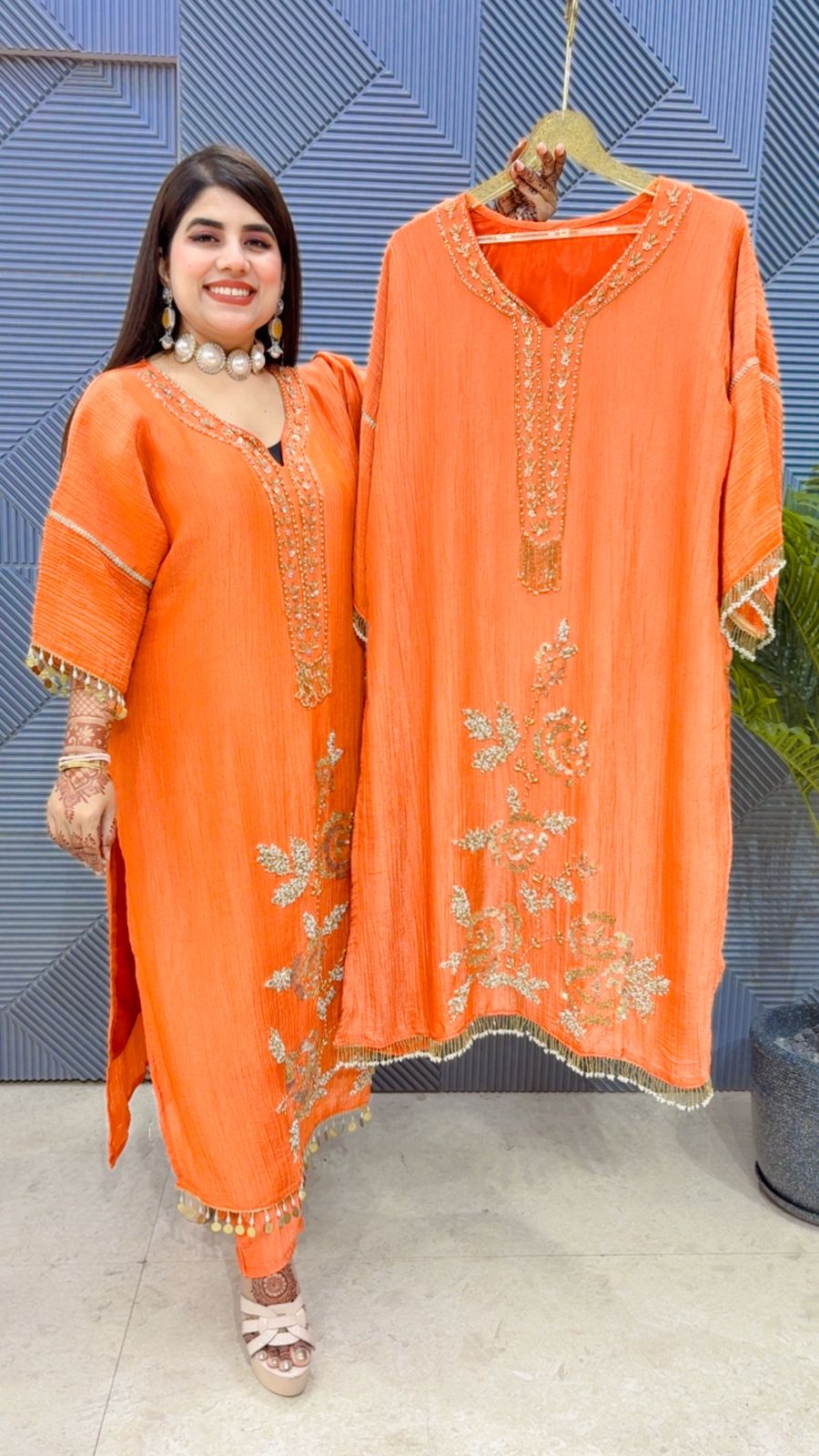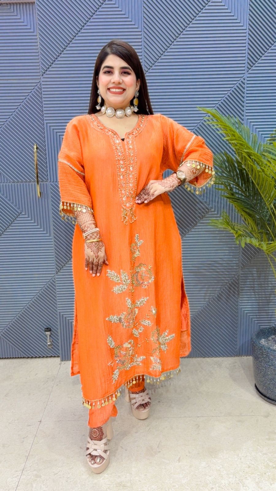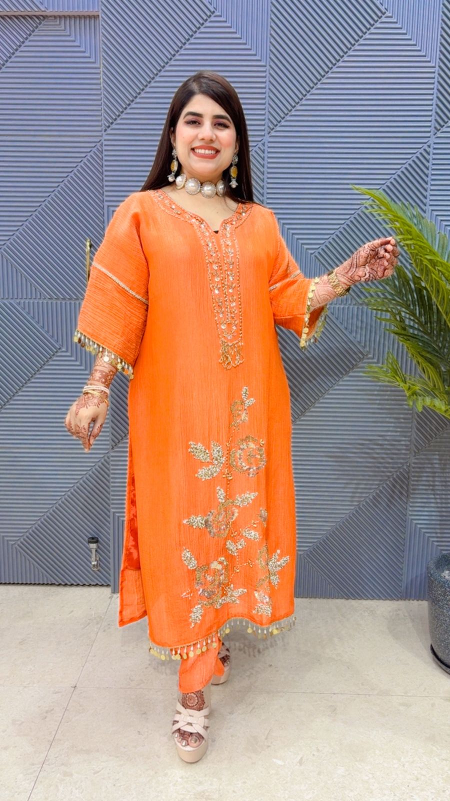 This BEAUTIFUL CORD SET WITH HANGING TISILS CUT DANA WORK AND KURTA LINGING (KURTA length:45, BOTTOM length: 39-40) Approx is perfect for the season . The CORD SET beautifully to create a versatile and stylish outfit. your summer wardrobe with this luxurious addition, adding a touch of sparkle and charm to any occasion.