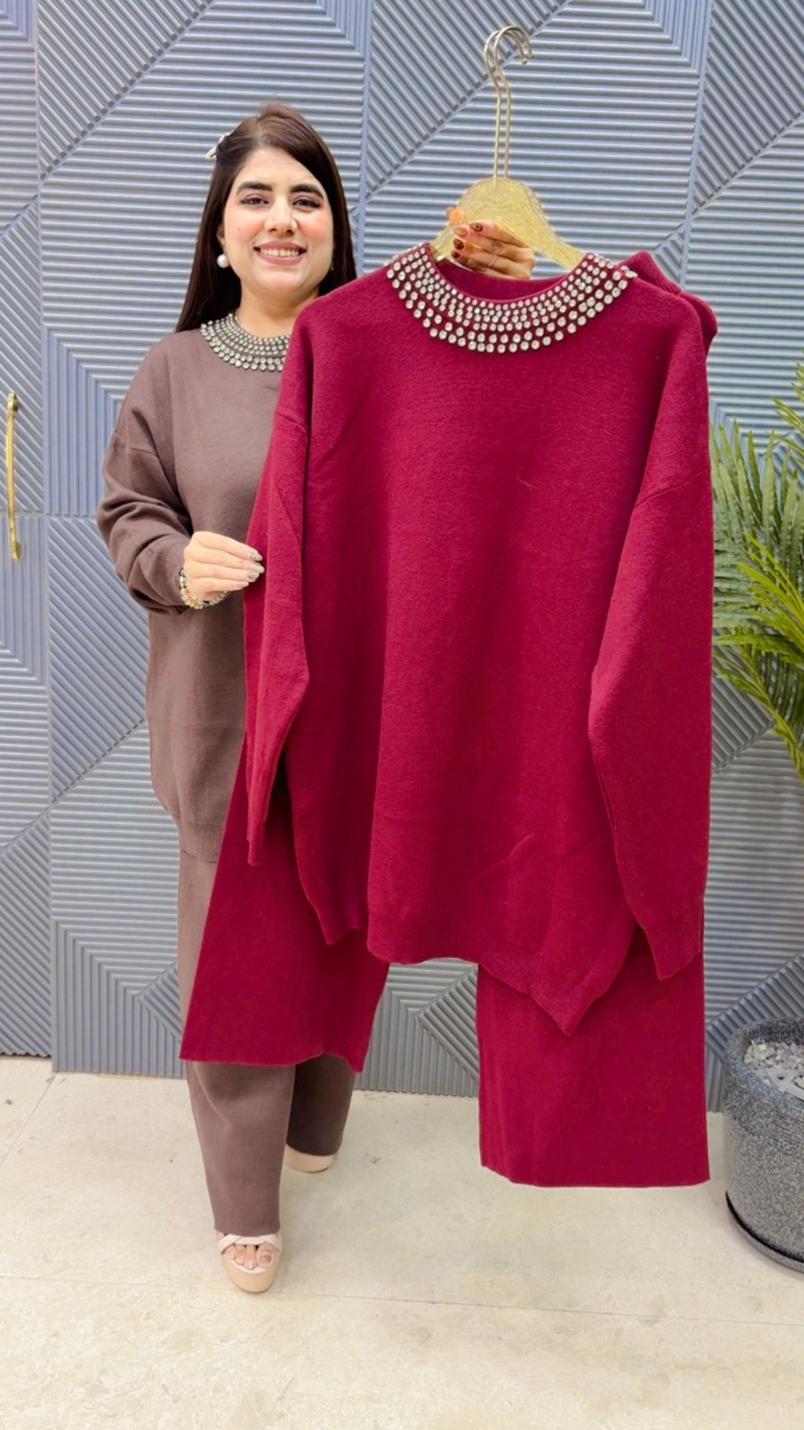 This BEAUTIFUL CORD SET (TOP LENGTH: 30-31 BOTTOM LENGTH-39-40)(FREE SIZE STRETCHABLE) Approx is perfect for the season . ThIS CORD SET beautifully to create a versatile and stylish outfit. your WINTER wardrobe with this luxurious addition, adding a touch of sparkle and charm to any occasion.( DELIVERY DAYS WITHIN: 12-15 DAYS)