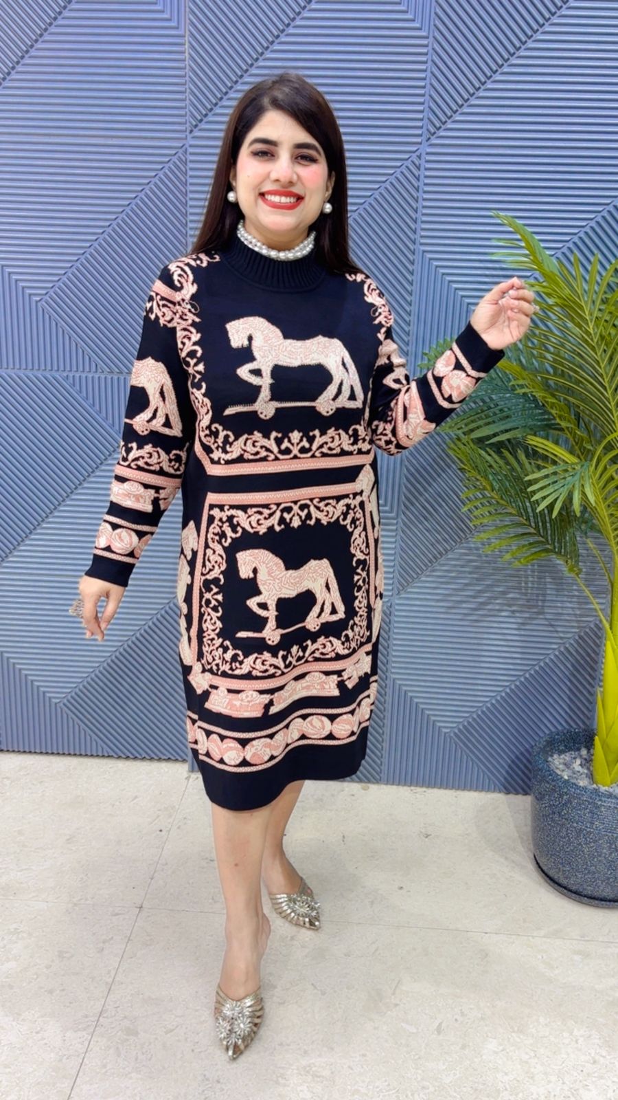 This BEAUTIFUL FULL SLEEVS WOOLEN DRESS WITH HORSE PRINT (LENGTH: 37) Approx is perfect for the season . The DRESS beautifully to create a versatile and stylish outfit. your WINTER wardrobe with this luxurious addition, adding a touch of sparkle and charm to any occasion. ( DELIVERY DAYS WITHIN: 10-12 DAYS)