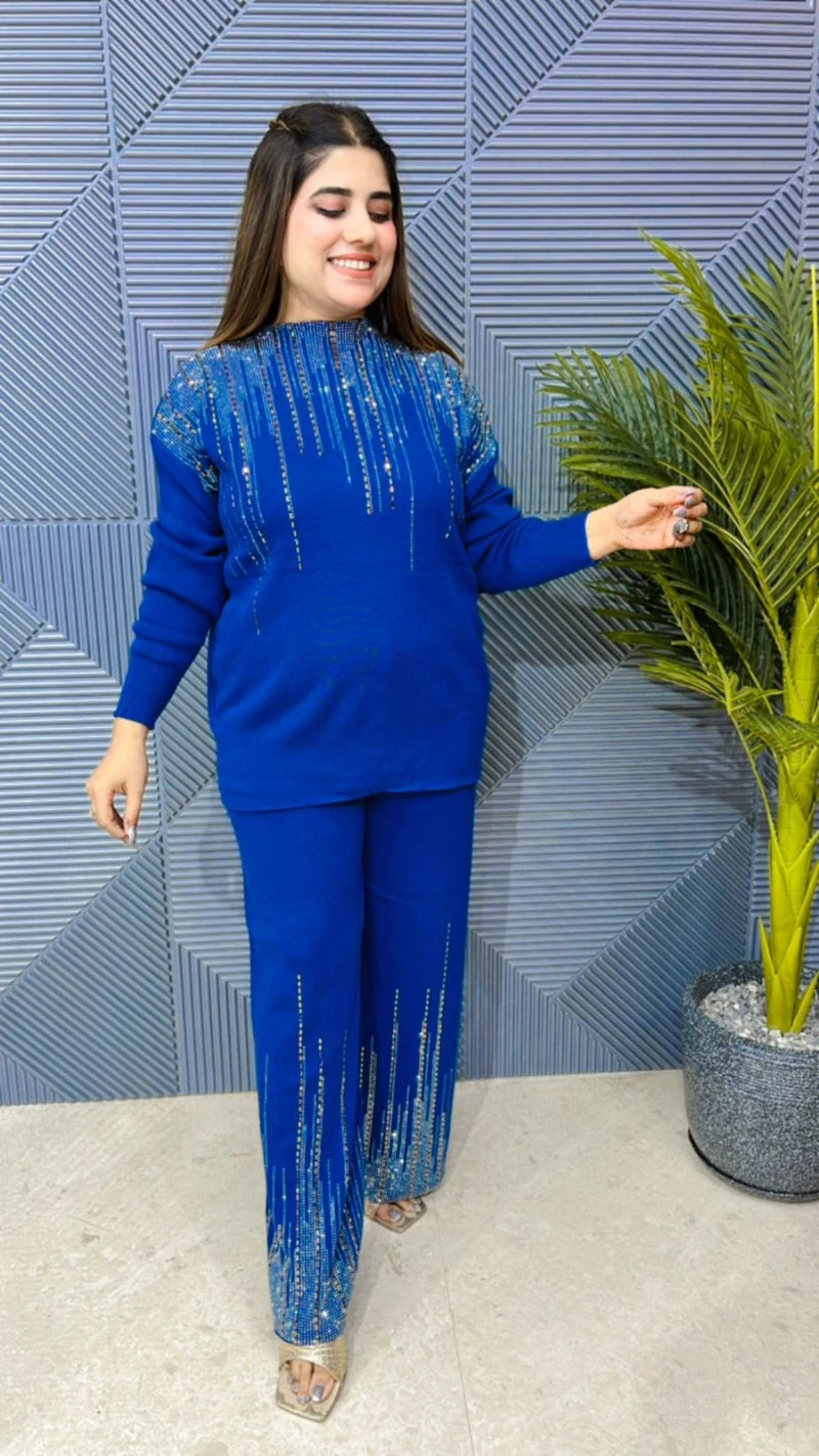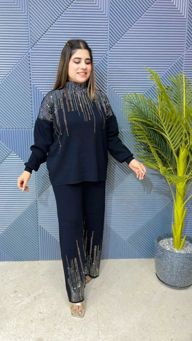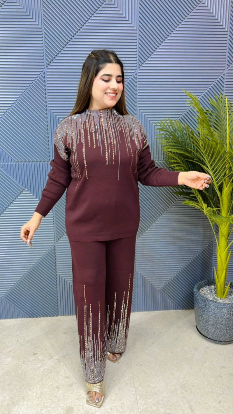 This beautiful premium knitted cord set features stunning Swarovski work, adding a touch of elegance to any outfit. Crafted with high-quality materials, this set is not only stylish, but also durable. Enhance your look with this stunning cord set.