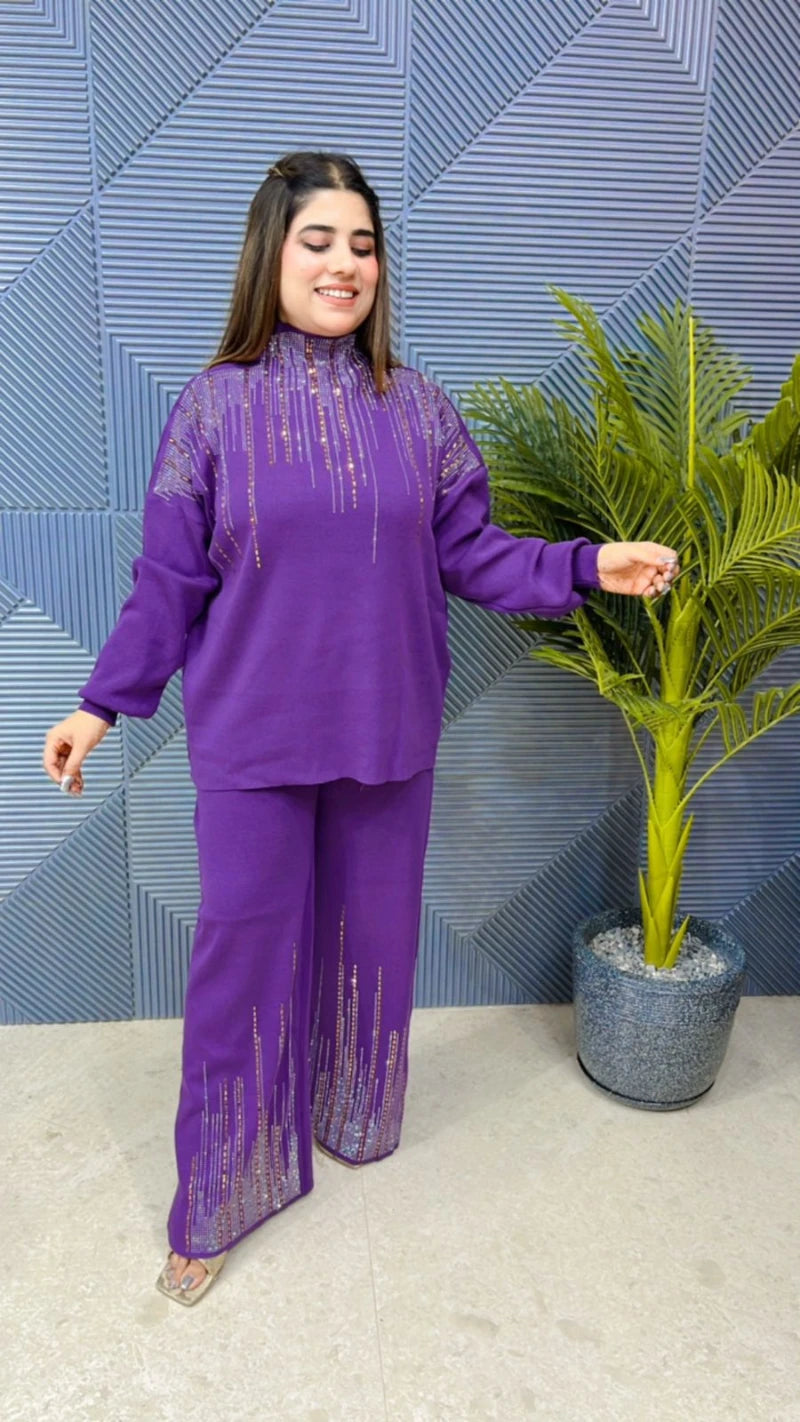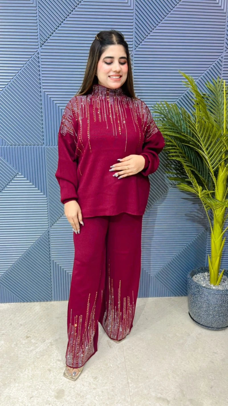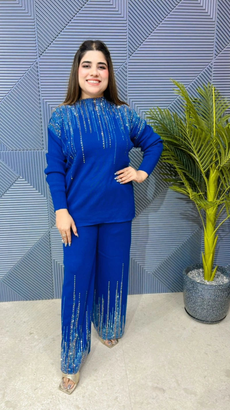 This beautiful premium knitted cord set features stunning Swarovski work, adding a touch of elegance to any outfit. Crafted with high-quality materials, this set is not only stylish, but also durable. Enhance your look with this stunning cord set.