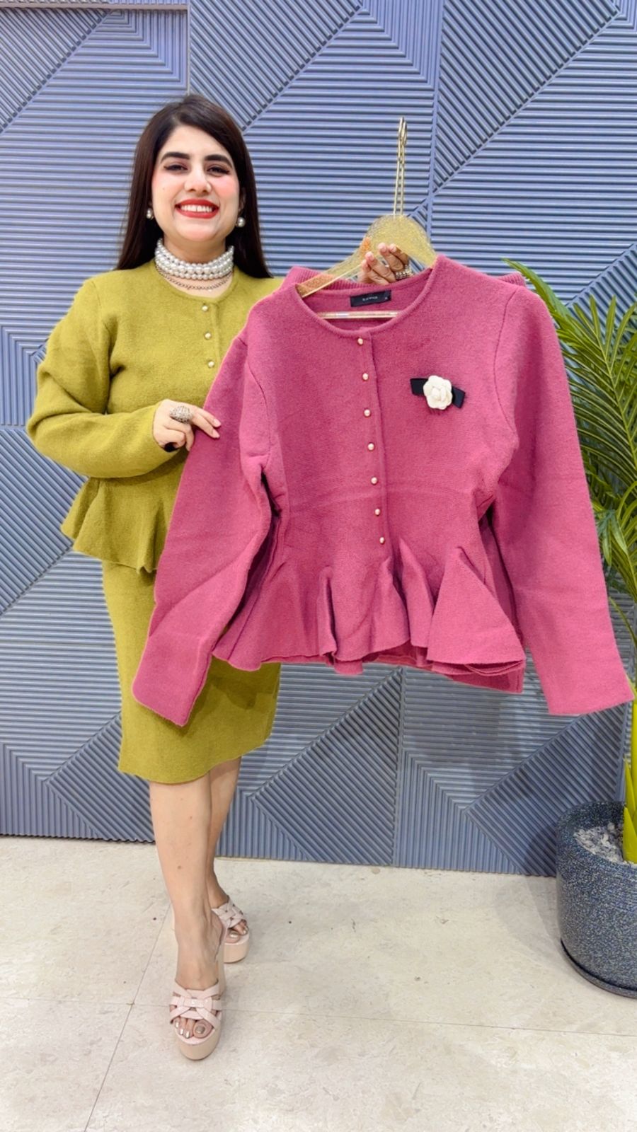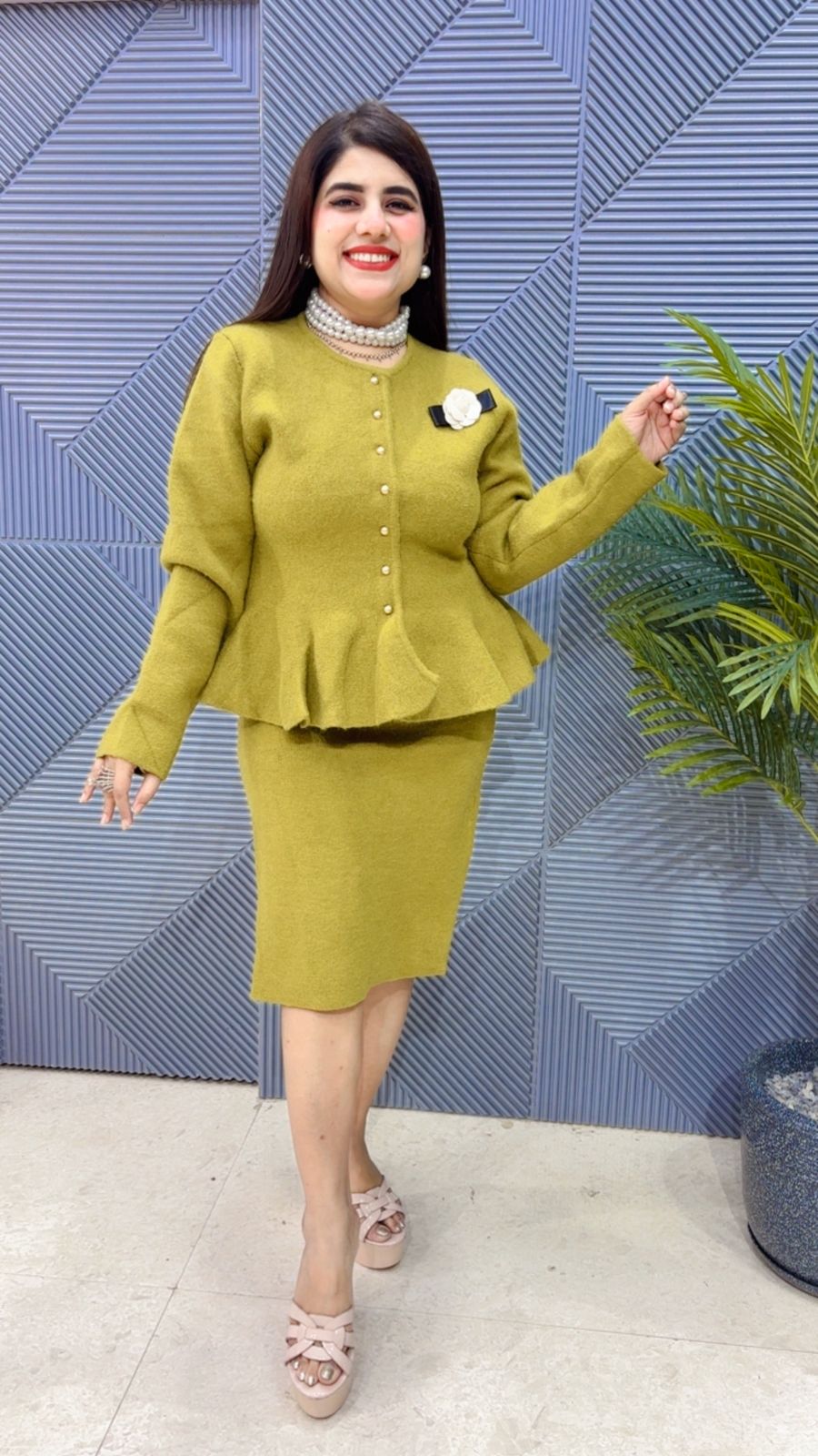 This BEAUTIFUL POPLIN WOOLEN SKIRT SET WITH FLOWER BROCH AND PEARL BUTTON (SKIRT LENGTH:29-30, TOP LENGTH: 23-24) Approx is perfect for the season . The SKIRT SET beautifully to create a versatile and stylish outfit. your wardrobe with this luxurious addition, adding a touch of sparkle and charm to any occasion. ( DELIVERY DAYS WITHIN: 10-12 DAYS)