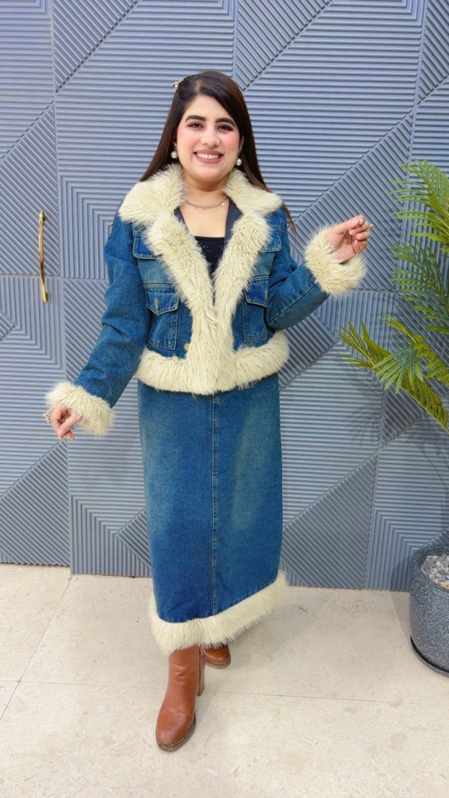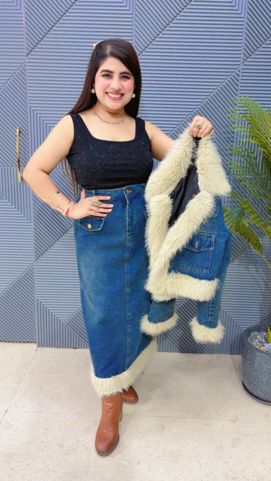 This BEAUTIFUL DENIM SKIRT SET (SKIRT LENGTH:30-31, TOP LENGTH: 19) Approx is perfect for the season . The SKIRT SET beautifully to create a versatile and stylish outfit. your wardrobe with this luxurious addition, adding a touch of sparkle and charm to any occasion. ( DELIVERY DAYS WITHIN: 10-12 DAYS)
