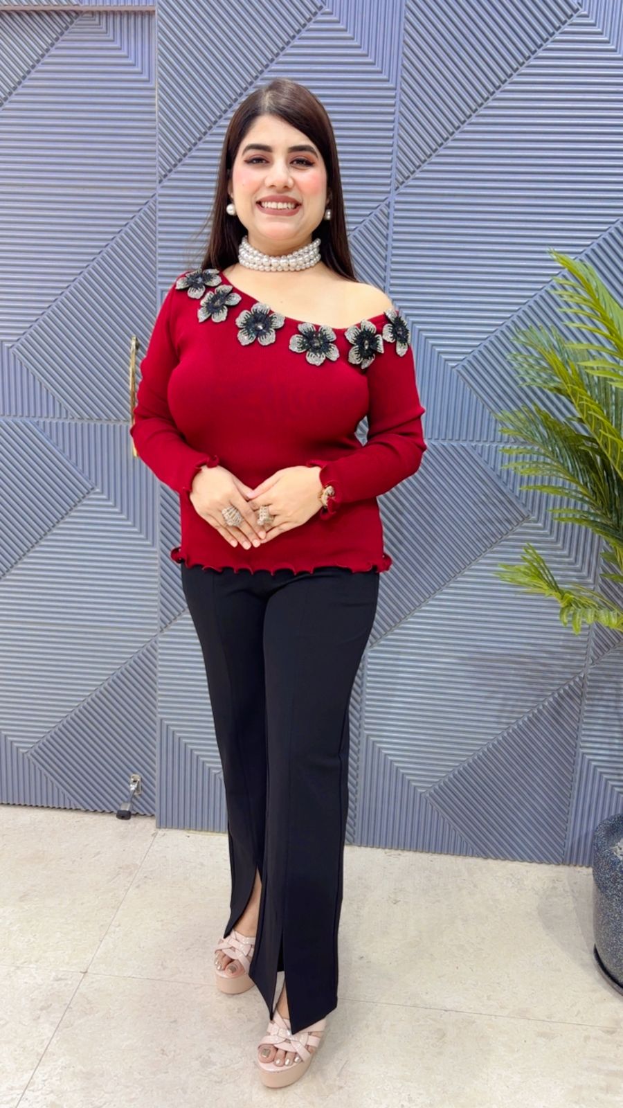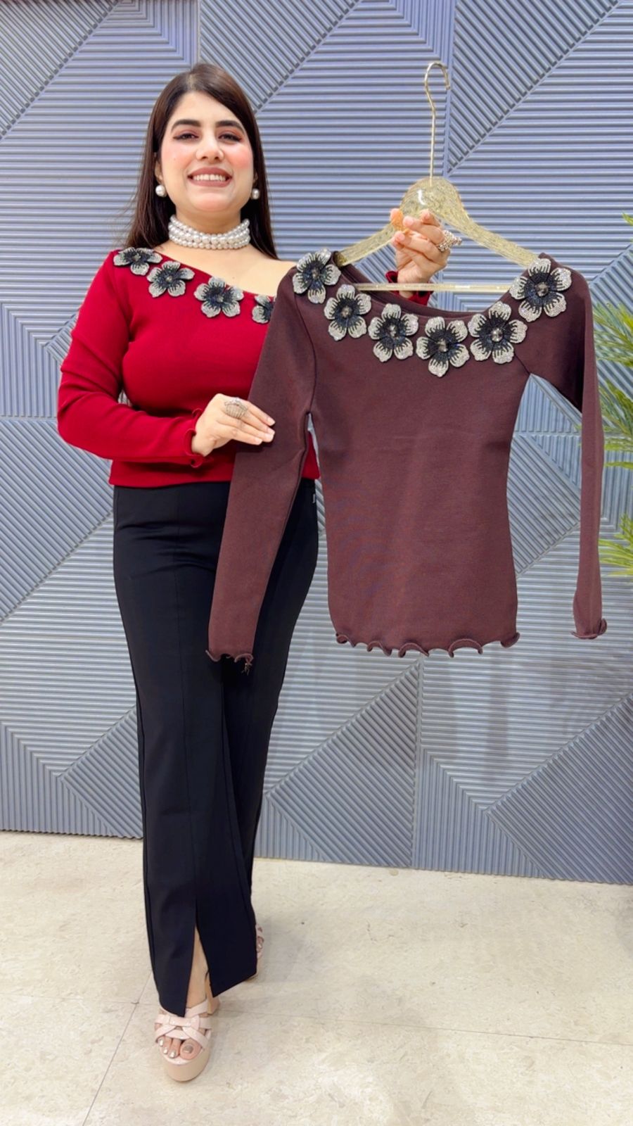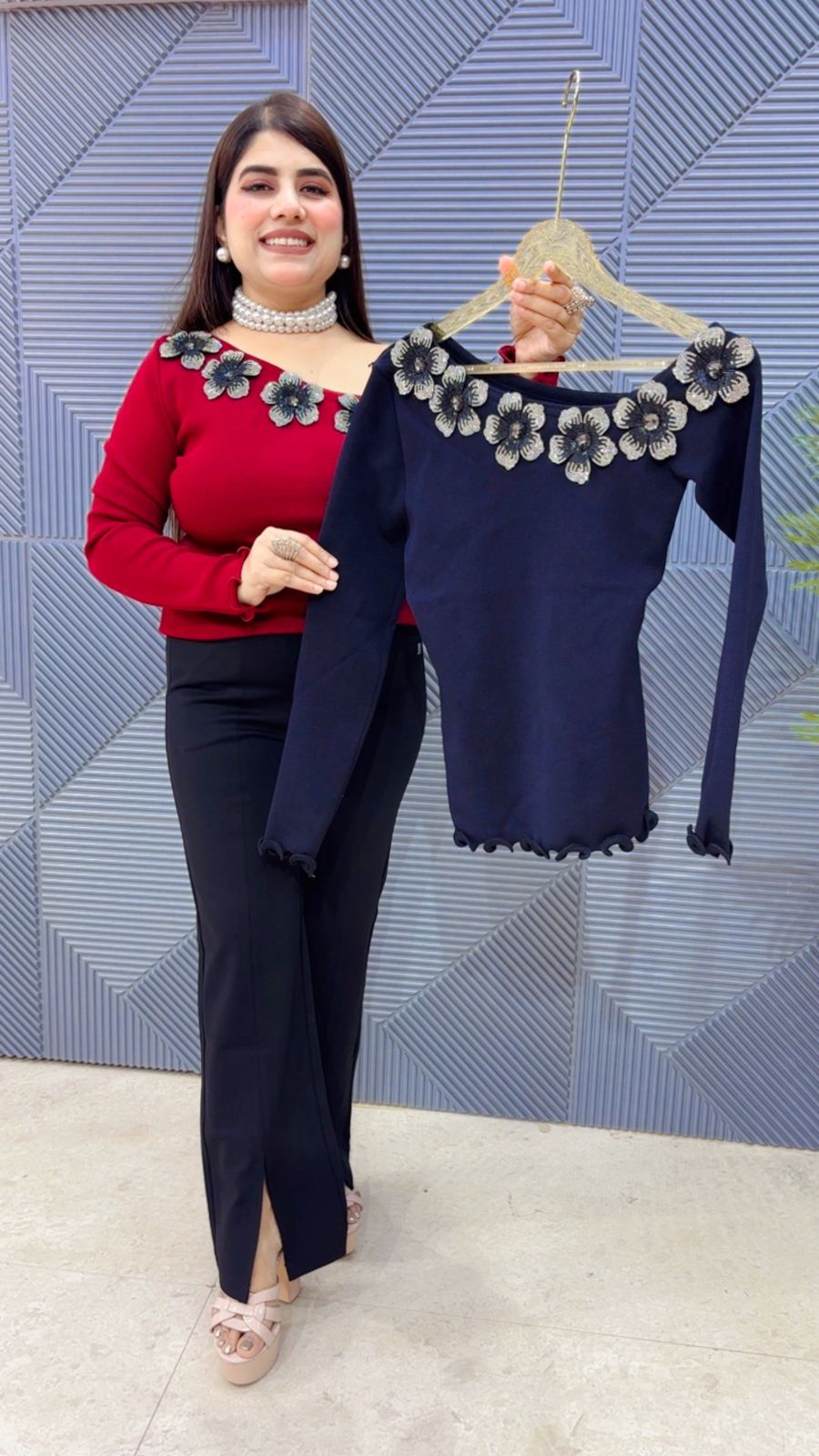 This BEAUTIFUL KNITTED TOP WITH FLOWER WORK ON NECK (LENGTH: 22) Approx is perfect for the season . The TOP beautifully to create a versatile and stylish outfit. your summer wardrobe with this luxurious addition, adding a touch of sparkle and charm to any occasion.