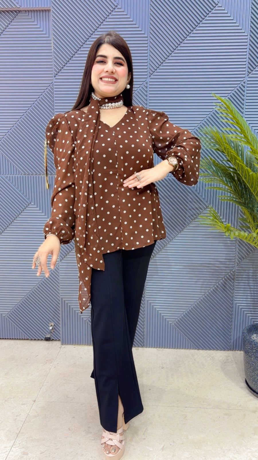 This BEAUTIFUL GEORGETTE POLKA TOP WITH SCARF ( LENGTH:26-27) is perfect for the season . THE TOP beautifully to create a versatile and stylish outfit. your summer wardrobe with this luxurious addition, adding a touch of sparkle and charm to any occasion.