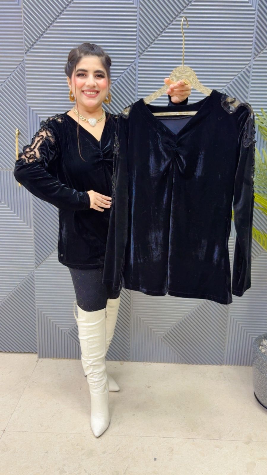 This BEAUTIFUL VELVET TOP WITH NET SLEEVE (LENGTH-27) (FREE SIZE STRETCHABLE) Approx is perfect for the season . The TOP beautifully to create a versatile and stylish outfit. your wardrobe with this luxurious addition, adding a touch of sparkle and charm to any occasion. ( DELIVERY DAYS WITHIN: 12-15 DAYS)