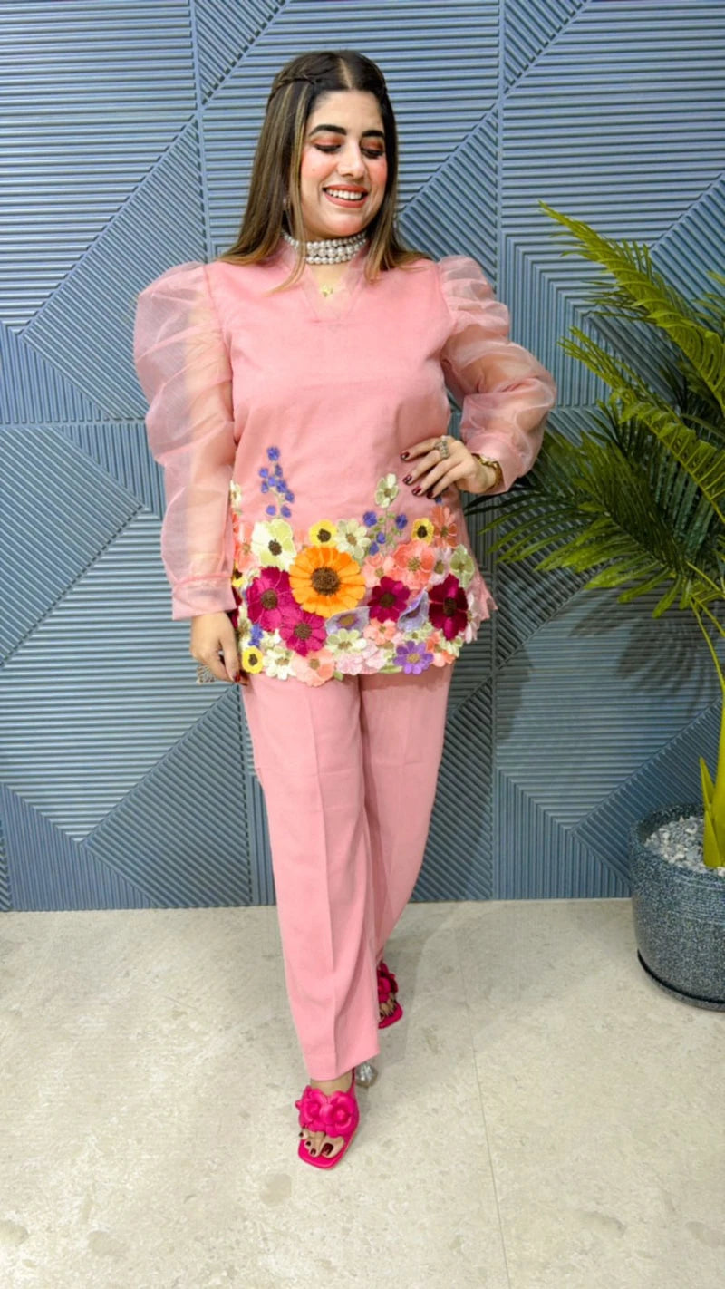 This Cord Set features beautiful 3D flower work and delicate organza sleeves, adding a touch of elegance and sophistication to any outfit. Made with high-quality, imported lycra stretch fabric, this set offers both comfort and style. Upgrade your wardrobe with this versatile and fashionable piece.
