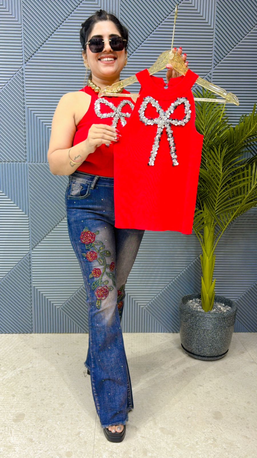 This Knitted Fabric Top features a stylish Bow Work design, adding a touch of elegance to any outfit. Made with premium quality fabric, it offers comfort and durability. Elevate your wardrobe with this versatile and chic piece.