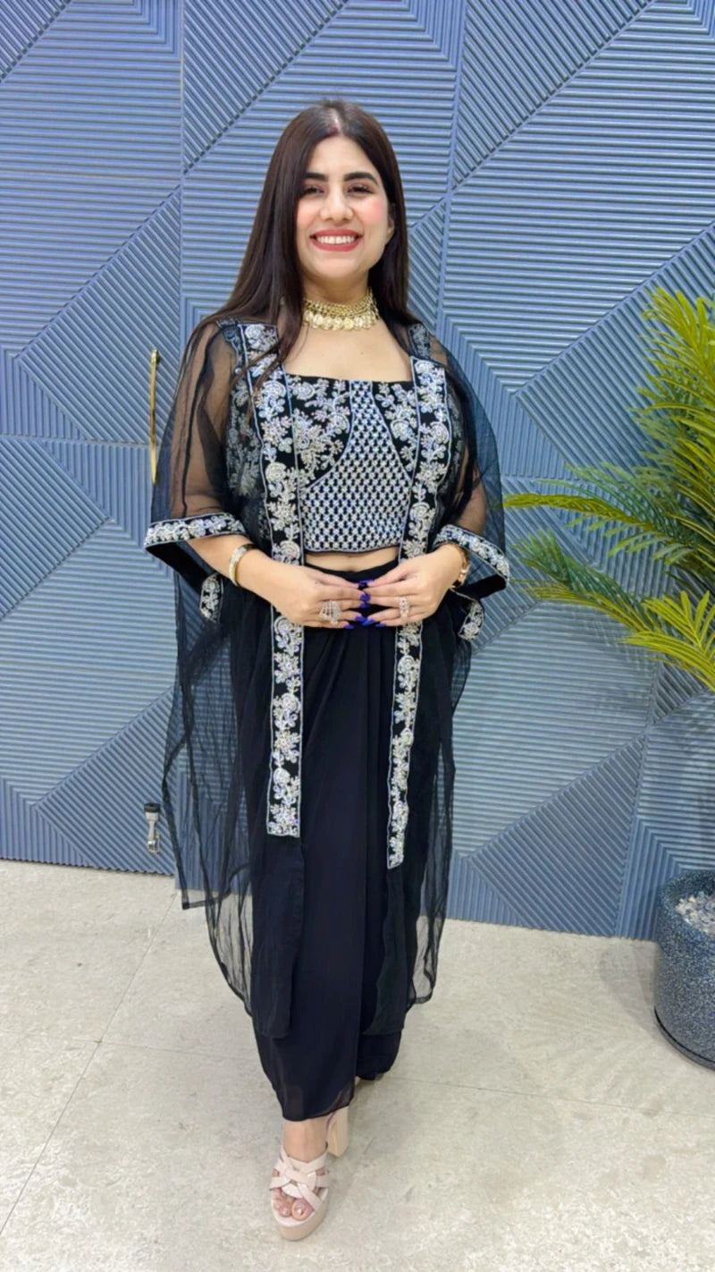 This BEAUTIFUL 3 PCS GEORGETTE FEBRIC DHOTI STYLE DRESS WITH CUT DANA MIRROR HAND WORK AND NET FEBRIC SHRUG (DHOTI LENGTH: 35-36, UPPER length :12-13,SHRUG: 48) is perfect for the season . The 3 PCS ANARKALI SUIT beautifully to create a versatile and stylish outfit. your summer wardrobe with this luxurious addition, adding a touch of sparkle and charm to any occasion .