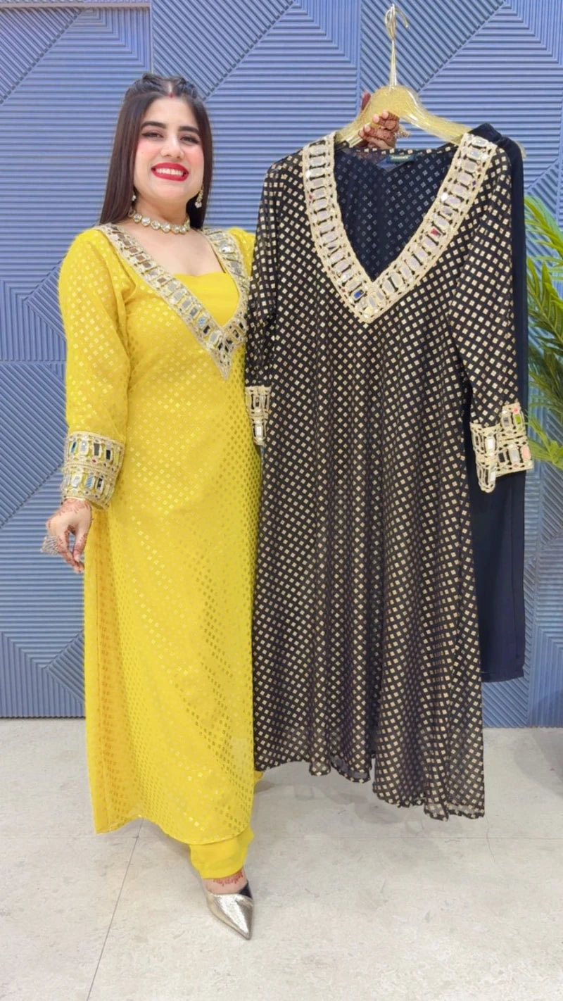 This BEAUTIFUL 3 PCS ETHENIC ANARKALI CO-ORD SET WITH ORIGINAL MIRROR WORK ON NECK AND SLEEVS AND PREMIUM PANT AND BUSTIER (KURTA length:48-49,BUSTIER length: 16-17, BOTTOM length: 39-40) Approx is perfect for the season . The 3 PCS SUIT beautifully to create a versatile and stylish outfit. your summer wardrobe with this luxurious addition, adding a touch of sparkle and charm to any occasion.