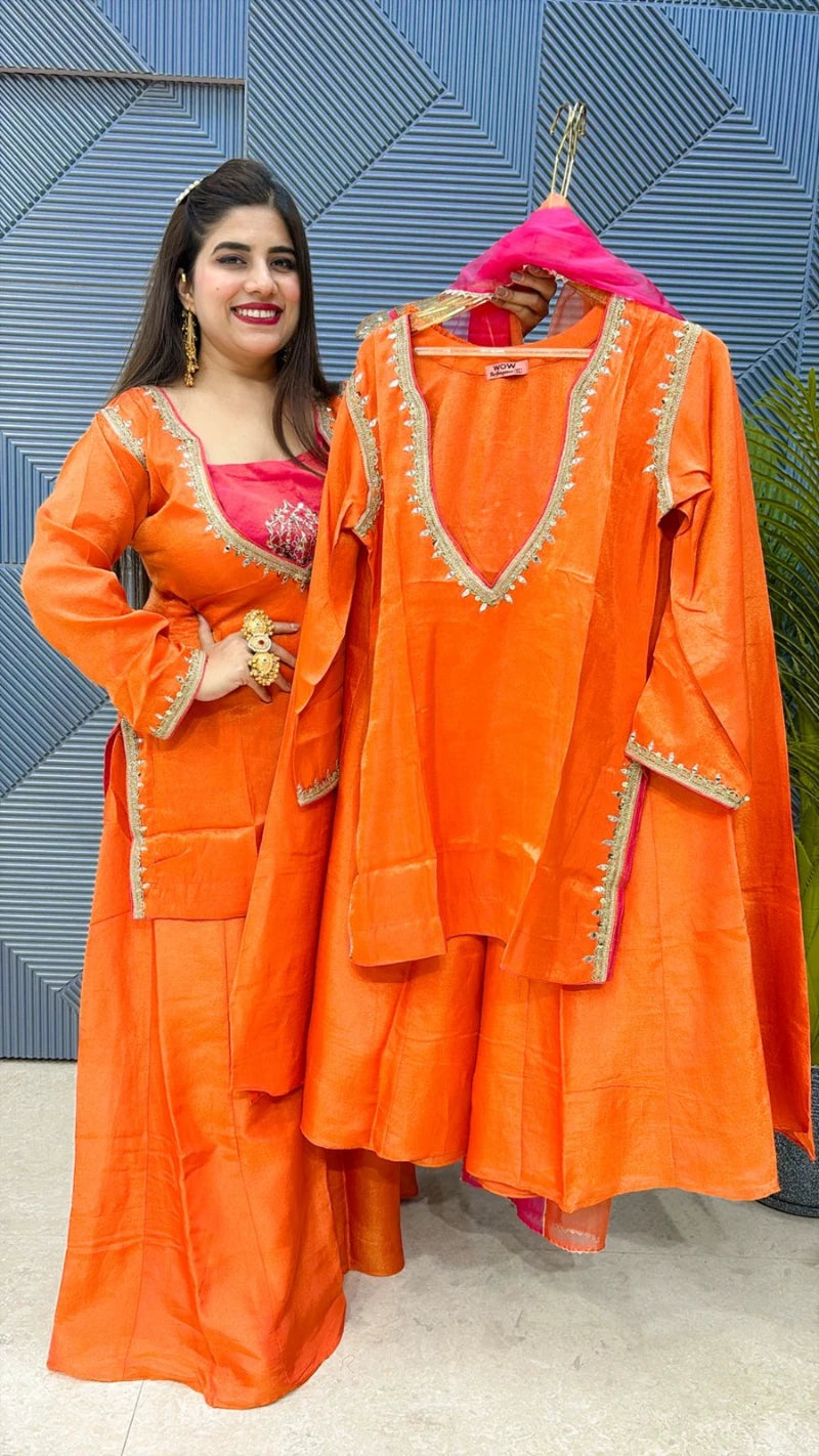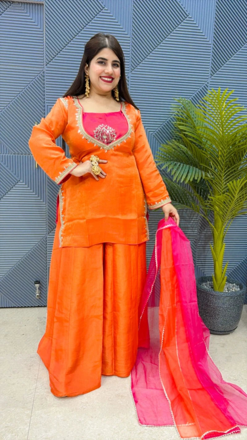 This BEAUTIFUL 3 PCS PLAZO SUIT WITH BUSTIER WITH LASE MIRROR WORK AND DOUBAL SHADE LASE DUPATTA is perfect for the season . 3 PSC PLAZO SUIT WITH BUSTIER (KURTA LENGTH: 30-31 ,BUSTIER LENGTH : 20 , BOTTOM LENGTH : 43-44 )Approx beautifully to create a versatile and stylish outfit. your summer wardrobe with this luxurious addition, adding a touch of sparkle and charm to any occasion.