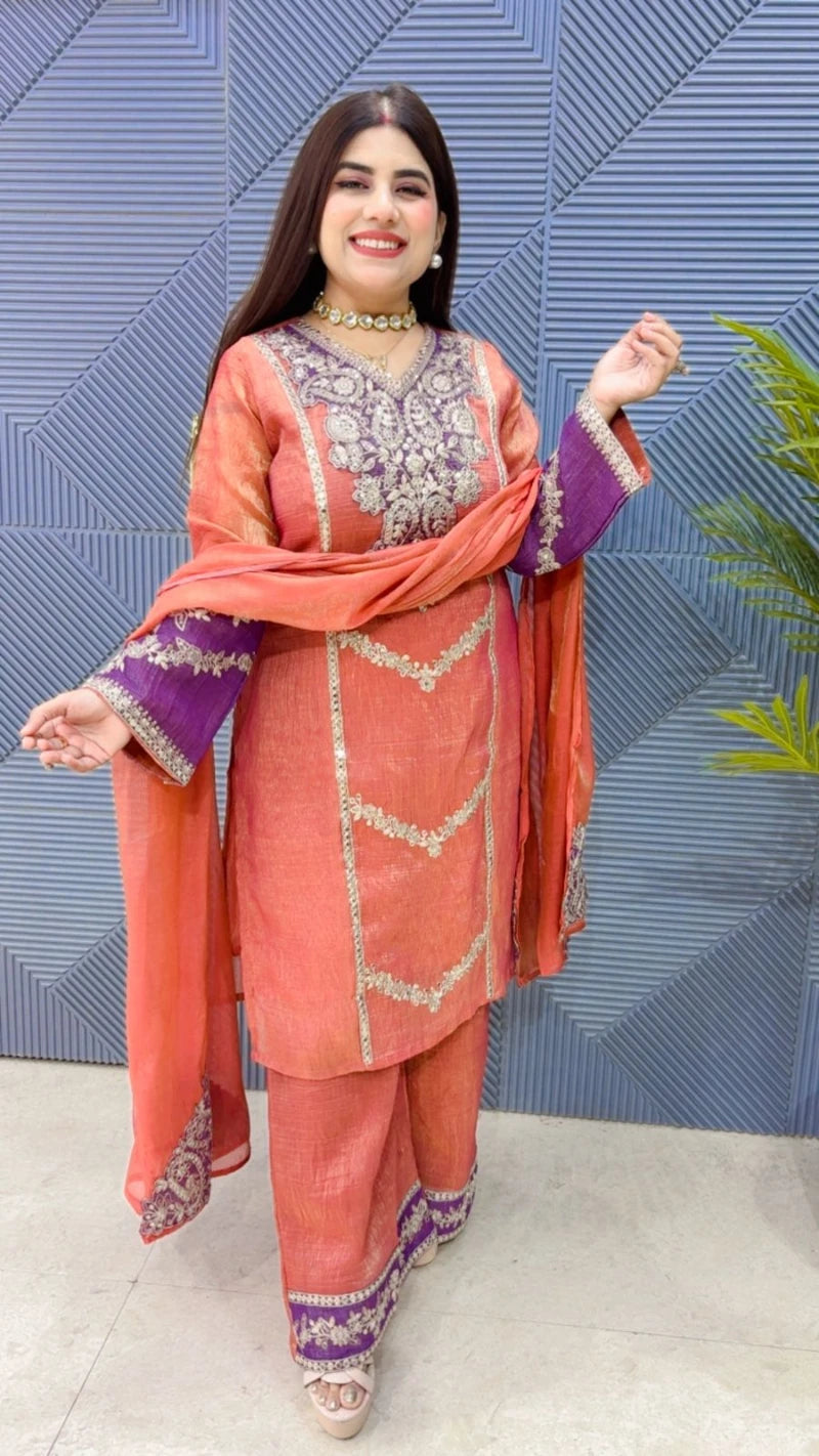 This BEAUTIFUL 3 PCS SUIT WITH PURPLE COLOUR CONTRAST SHIMMERI EFFECT FEBRIC AND GOLDEN SIPPI WORK, THREAD EMBROIDERY GOTA PATTI HAND WORK AND BEAUTIFUL DUPATTA (kurta length 40,bottom 40-41) Approx is perfect for the season . The 3 PCS SUIT beautifully to create a versatile and stylish outfit. your summer wardrobe with this luxurious addition, adding a touch of sparkle and charm to any occasion .