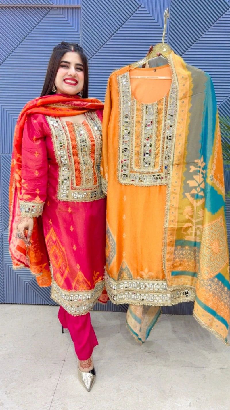 This BEAUTIFUL 3 PCS SUIT WITH ORIGINAL MIRROR GOTA PATTI WORK, 3D PRINT WORK, AND BEAUTIFUL 3D PRINT LASE DUPATTA (KURTA length:41-42, BOTTOM length: 39-40) Approx is perfect for the season . The 3 PCS SUIT beautifully to create a versatile and stylish outfit. your summer wardrobe with this luxurious addition, adding a touch of sparkle and charm to any occasion.