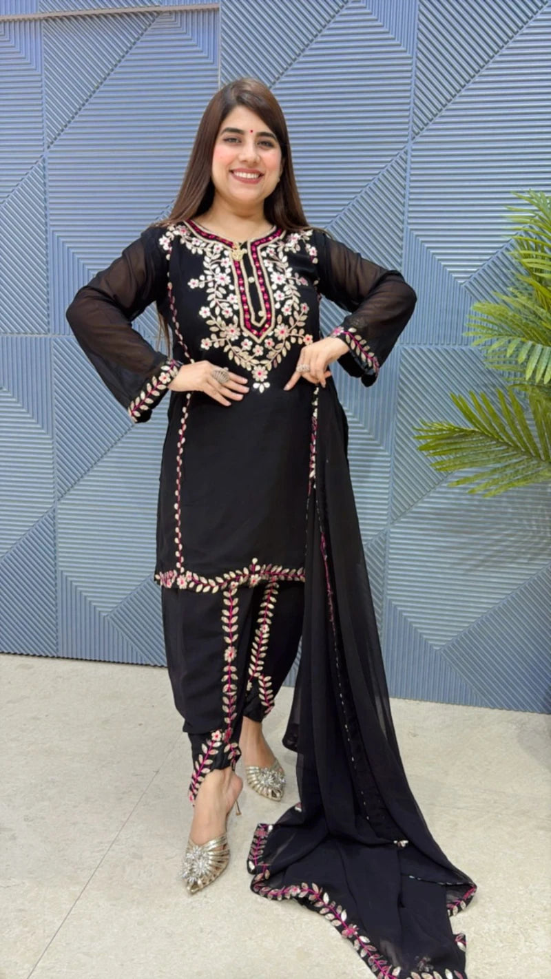 This BEAUTIFUL 3 PCS TULIP PANT SUIT WITH GOTA PATTI MIRROR EMBROIDERY WORK AND LASE DUPATTA (kurta length 36,bottom 41)Approx is perfect for the season . The 3 PCS SUIT beautifully to create a versatile and stylish outfit. your summer wardrobe with this luxurious addition, adding a touch of sparkle and charm to any occasion .