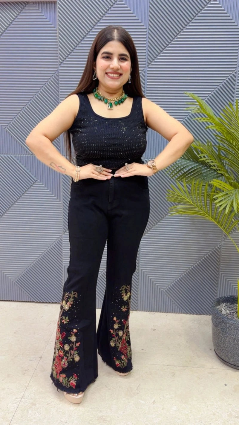 This BEAUTIFUL PARTYWEAR DENIM BELL BOTTOM WITH SEQUENCE THREAD EMBROIDERY WORK (LENGTH: 41-42) Approx is perfect for the season . The BOTTOM beautifully to create a versatile and stylish outfit. your wardrobe with this luxurious addition, adding a touch of sparkle and charm to any occasion. ( DELIVERY DAYS WITHIN: 10-12 DAYS)