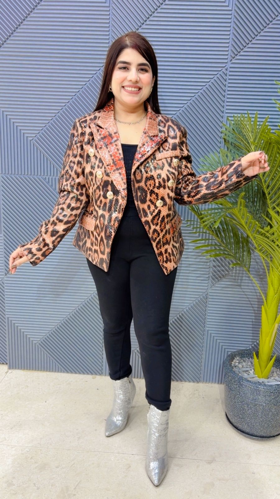 This BEAUTIFUL PARTYWEAR LEOPERD PRINT BLAZER WITH SEQUENCE WORK (LENGTH-22-23) (FREE SIZE STRETCHABLE) Approx is perfect for the season . The BLAZER beautifully to create a versatile and stylish outfit. your wardrobe with this luxurious addition, adding a touch of sparkle and charm to any occasion. ( DELIVERY DAYS WITHIN: 12-15 DAYS)