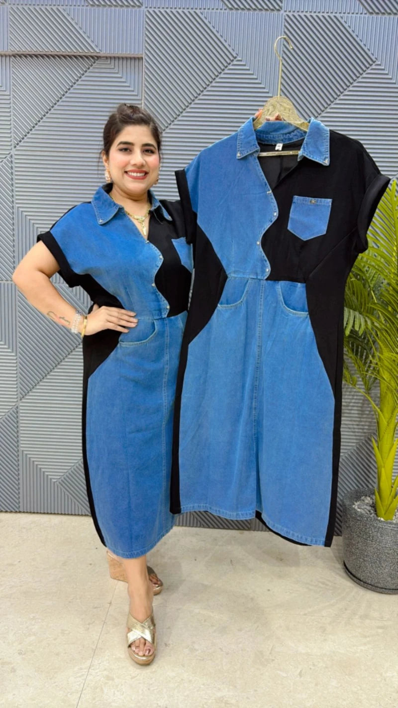 This DENIM DRESS WITH POCKET (LENGTH:45) is perfect for the season . THE DENIM DRESS beautifully to create a versatile and stylish outfit. your summer wardrobe with this luxurious addition, adding a touch of sparkle and charm to any occasion.