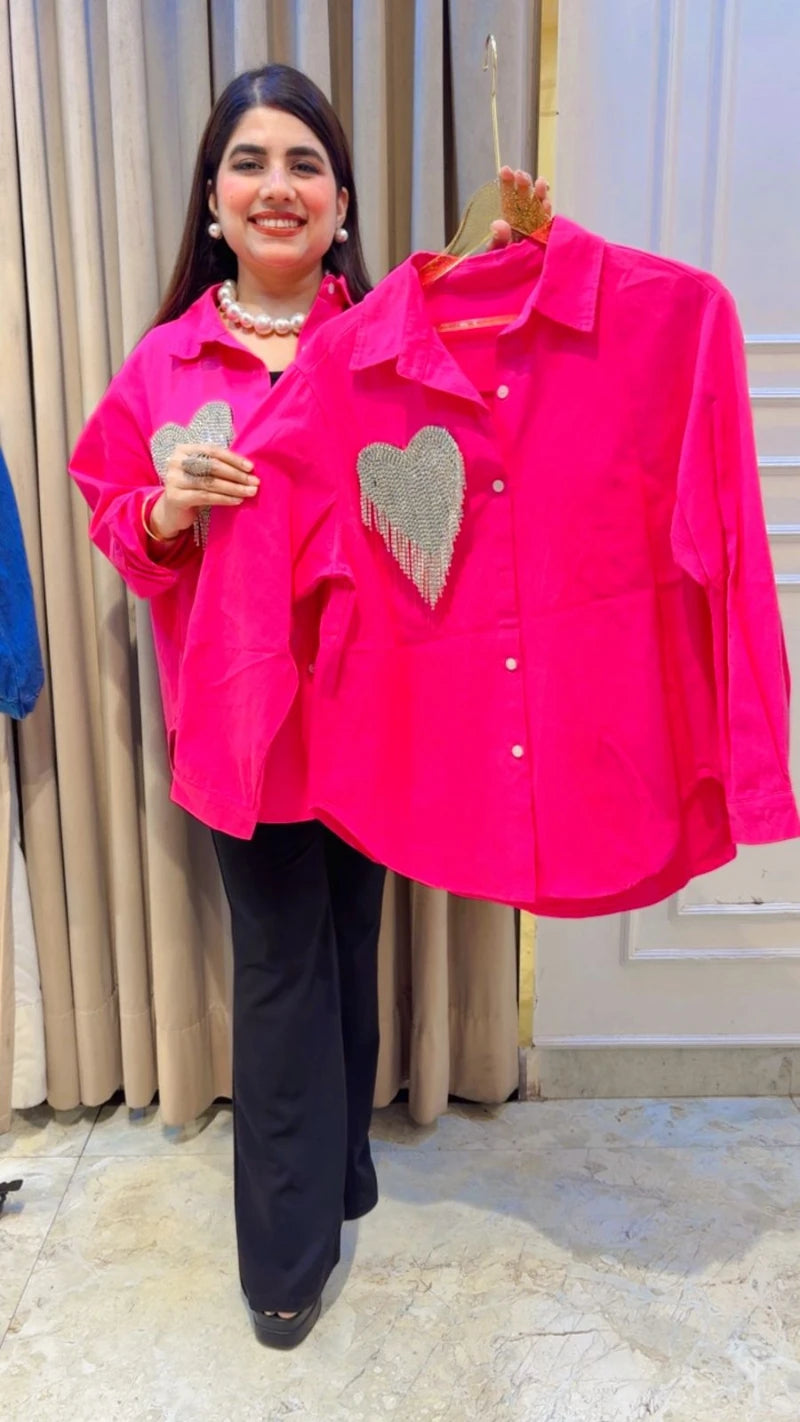 This BEAUTIFUL DENIM SHIRT WITH BEAUTIFUL STUDED HEART WORK ( LENGTH: LENGTH: 29-30) Approx is perfect for the season . The SHIRT beautifully to create a versatile and stylish outfit. your wardrobe with this luxurious addition, adding a touch of sparkle and charm to any occasion. ( DELIVERY DAYS WITHIN: 10-12 DAYS)