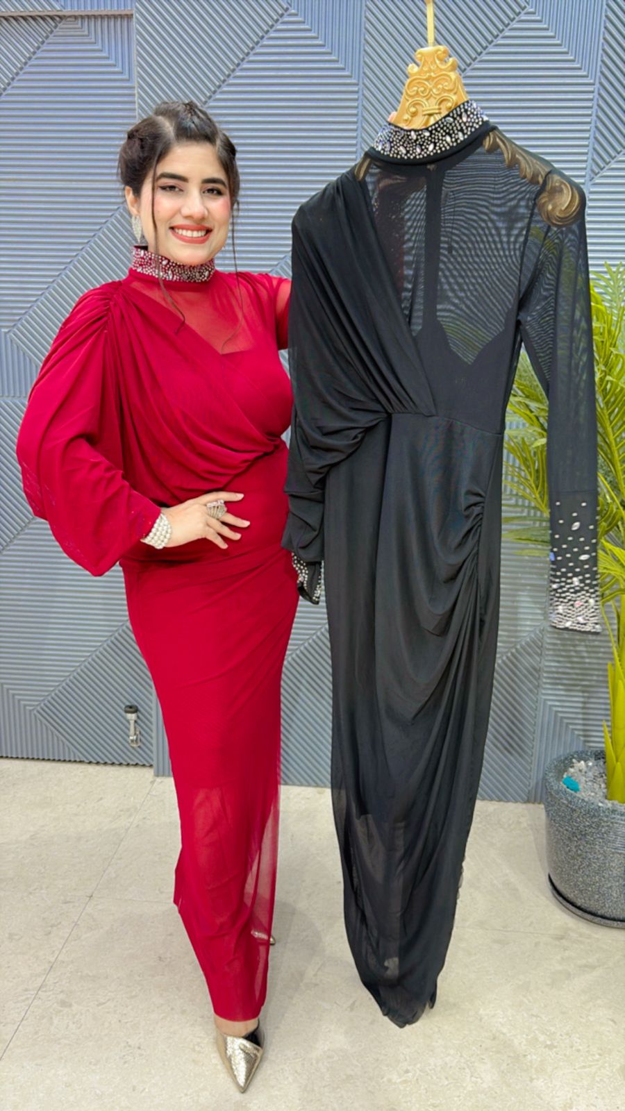 This BEAUTIFUL POWERNET DRESS WITH LINING ( LENGTH: 56 )Approx is perfect for the season . THE DRESS beautifully to create a versatile and stylish outfit. your summer wardrobe with this luxurious addition, adding a touch of sparkle and charm to any occasion.