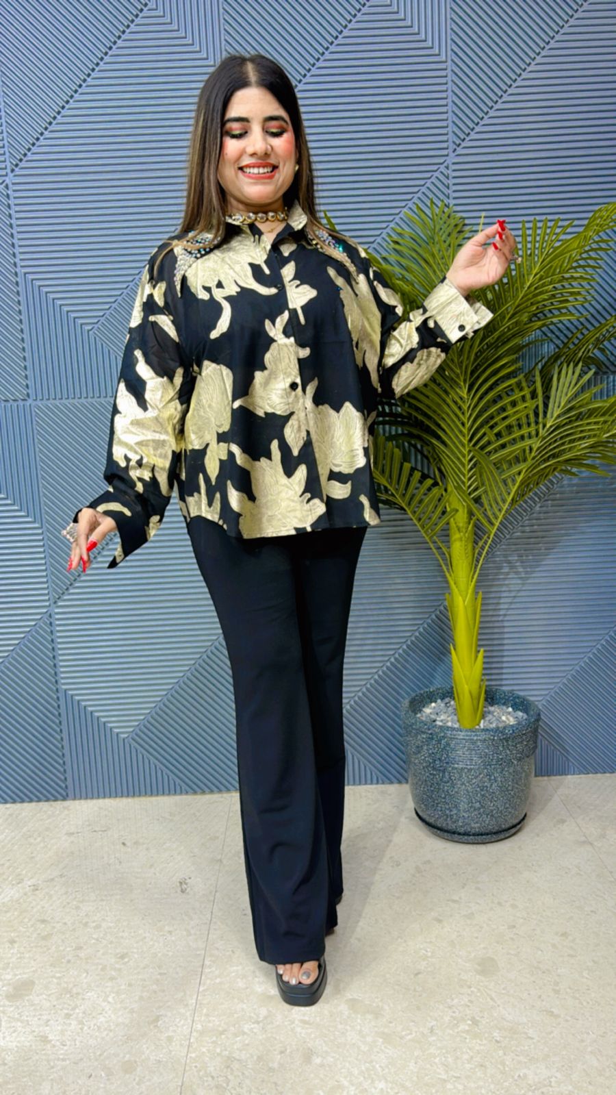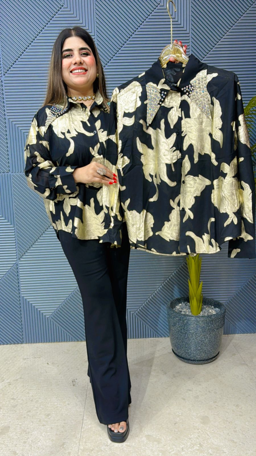 Upgrade your wardrobe with our Premium Foil Shirt. Made with high-quality materials and exquisite studded work, this shirt will elevate your style to the next level. Stand out from the crowd and make a statement with this luxurious and unique piece.