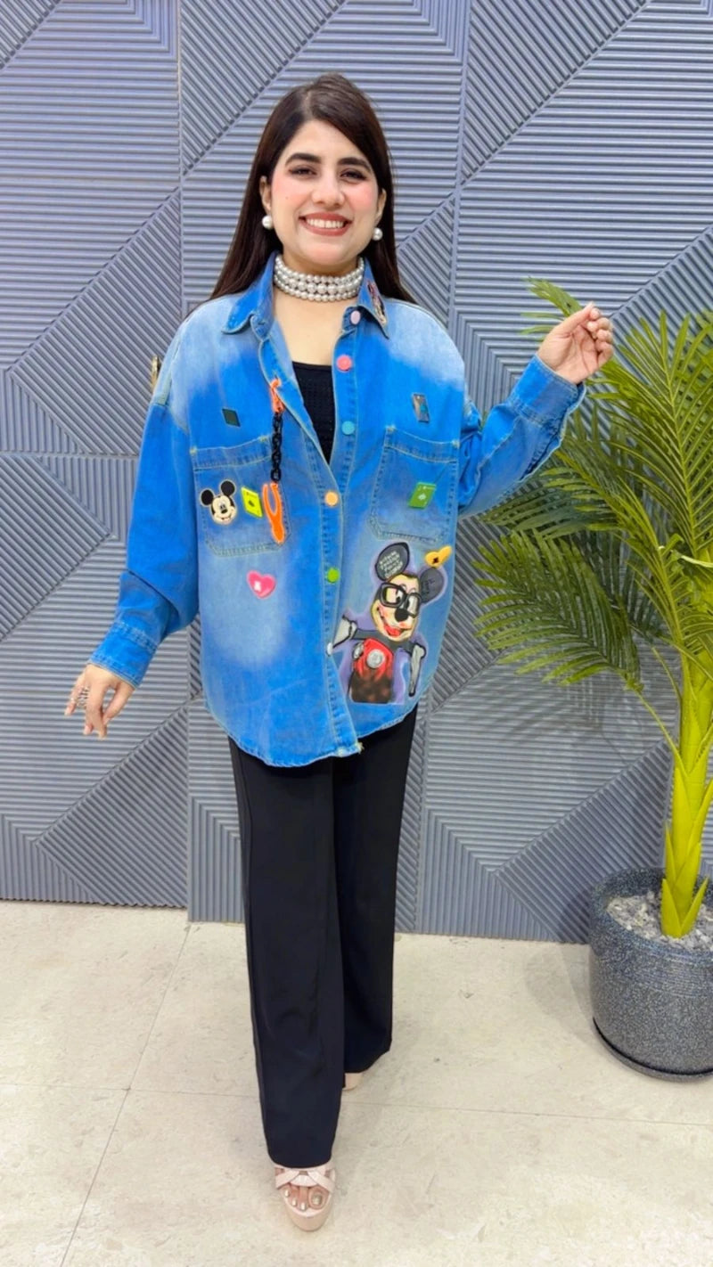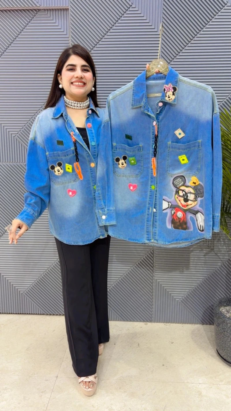 This BEAUTIFUL MIKKEY DENIM SHIRT (LENGTH:31) Approx is perfect for the season . The DENIM SHIRT beautifully to create a versatile and stylish outfit. your wardrobe with this luxurious addition, adding a touch of sparkle and charm to any occasion. ( DELIVERY DAYS WITHIN: 10-12 DAYS)