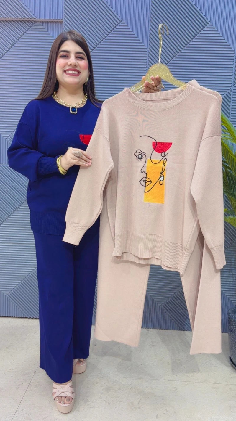 This BEAUTIFUL CO-ORD SET FOR PRE-WINTER WITH BEAUTIFUL THREAD WORK FACE AND NITTED FEBRIC (TOP LENGTH: 26-27, BOTTOM LENGTH: 40-41) Approx is perfect for the season . The CO-ORD SET beautifully to create a versatile and stylish outfit. your summer wardrobe with this luxurious addition, adding a touch of sparkle and charm to any occasion.