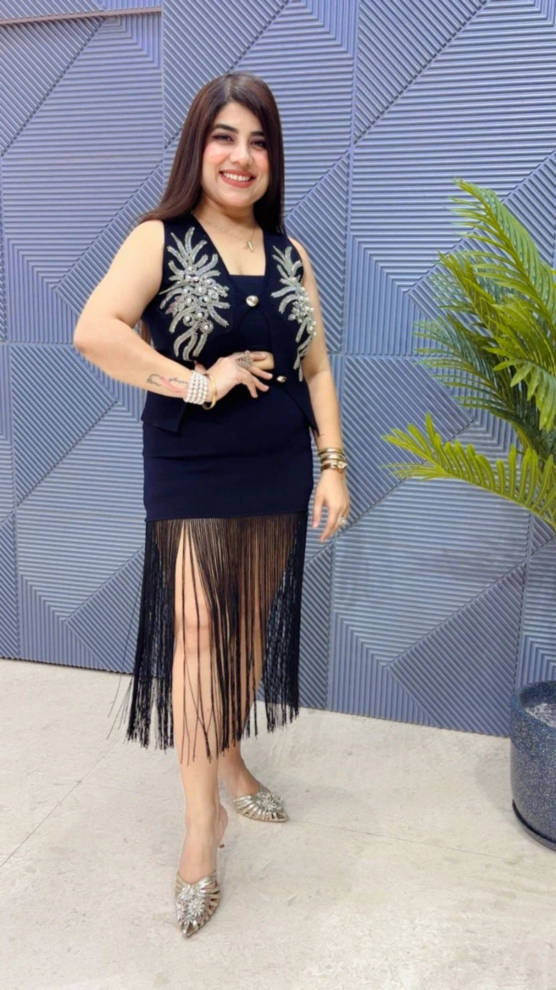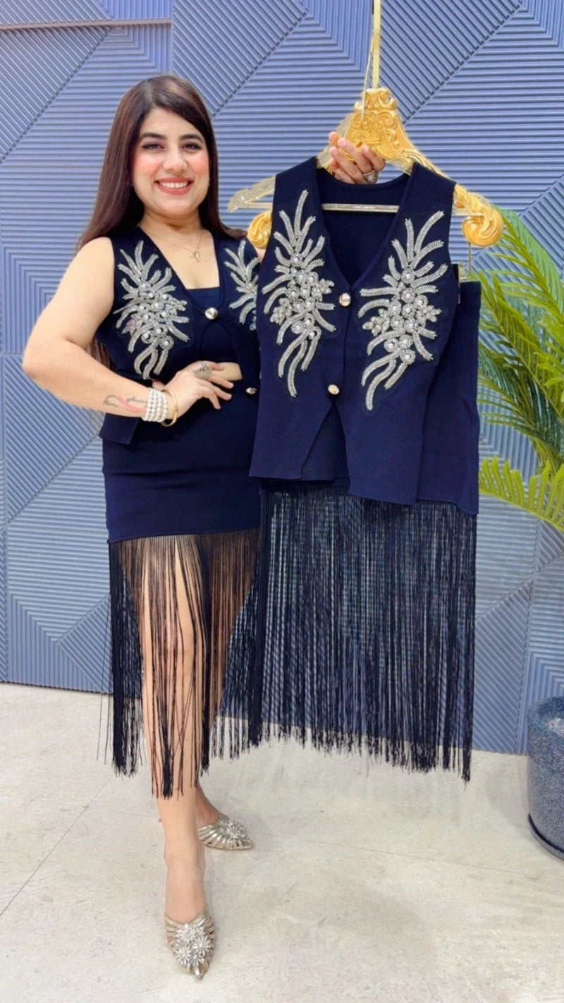 This BEAUTIFUL SKIRT CO-ORD SET WITH CUT DANA STUDDED WORK ON TOP (TOP LENGTH: 20-21, SKIRT LENGTH: 32-33) Approx is perfect for the season . The SKIRT CO-ORD SET beautifully to create a versatile and stylish outfit. your summer wardrobe with this luxurious addition, adding a touch of sparkle and charm to any occasion.