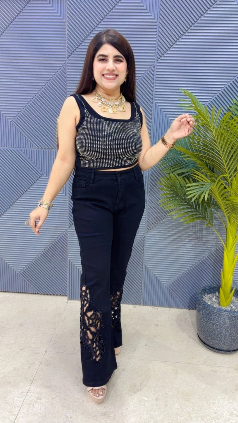 This BEAUTIFUL BOTTOM WITH LASER CUT SWAROVSKI WORK (LENGTH: 39-40) Approx is perfect for the season . The BOTTOM beautifully to create a versatile and stylish outfit. your wardrobe with this luxurious addition, adding a touch of sparkle and charm to any occasion. ( DELIVERY DAYS WITHIN: 10-12 DAYS)