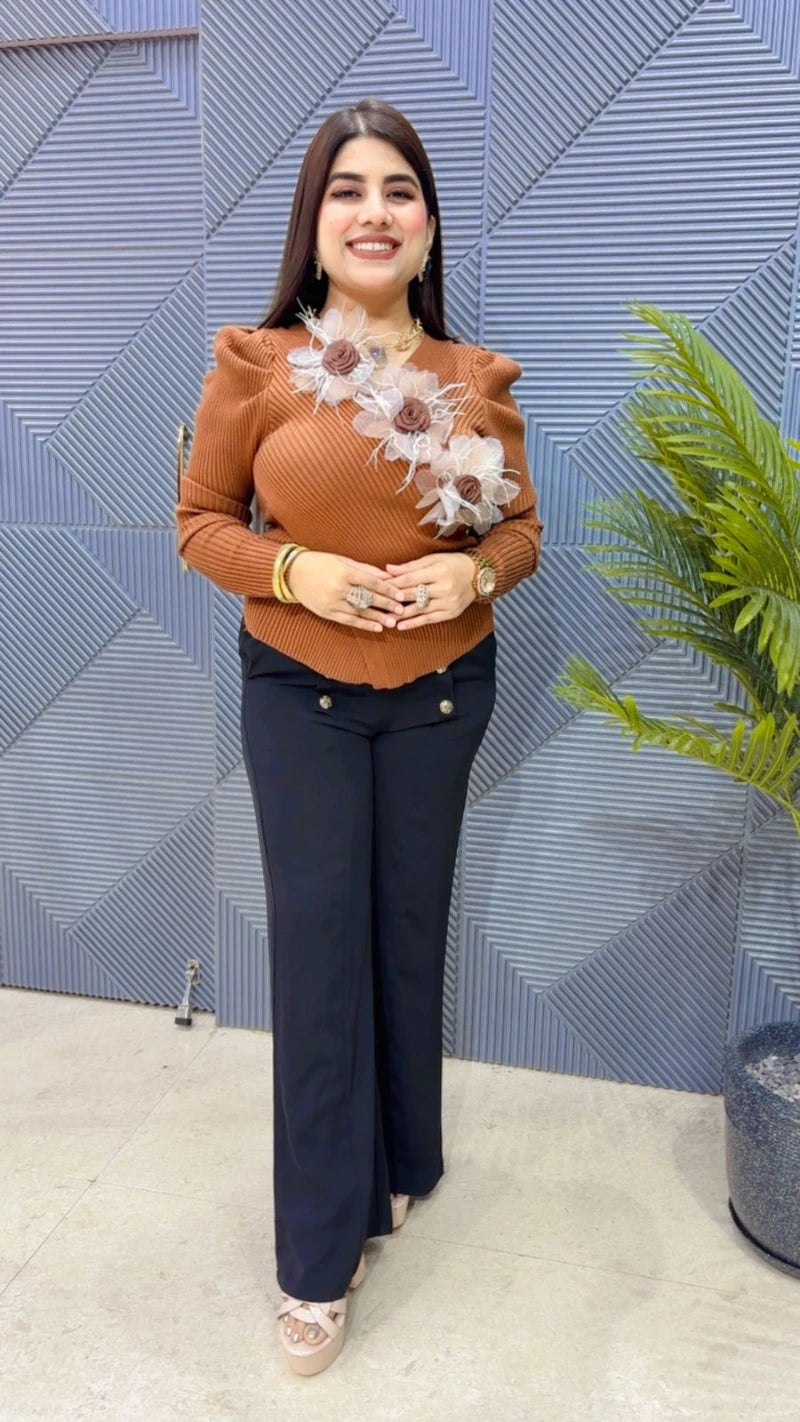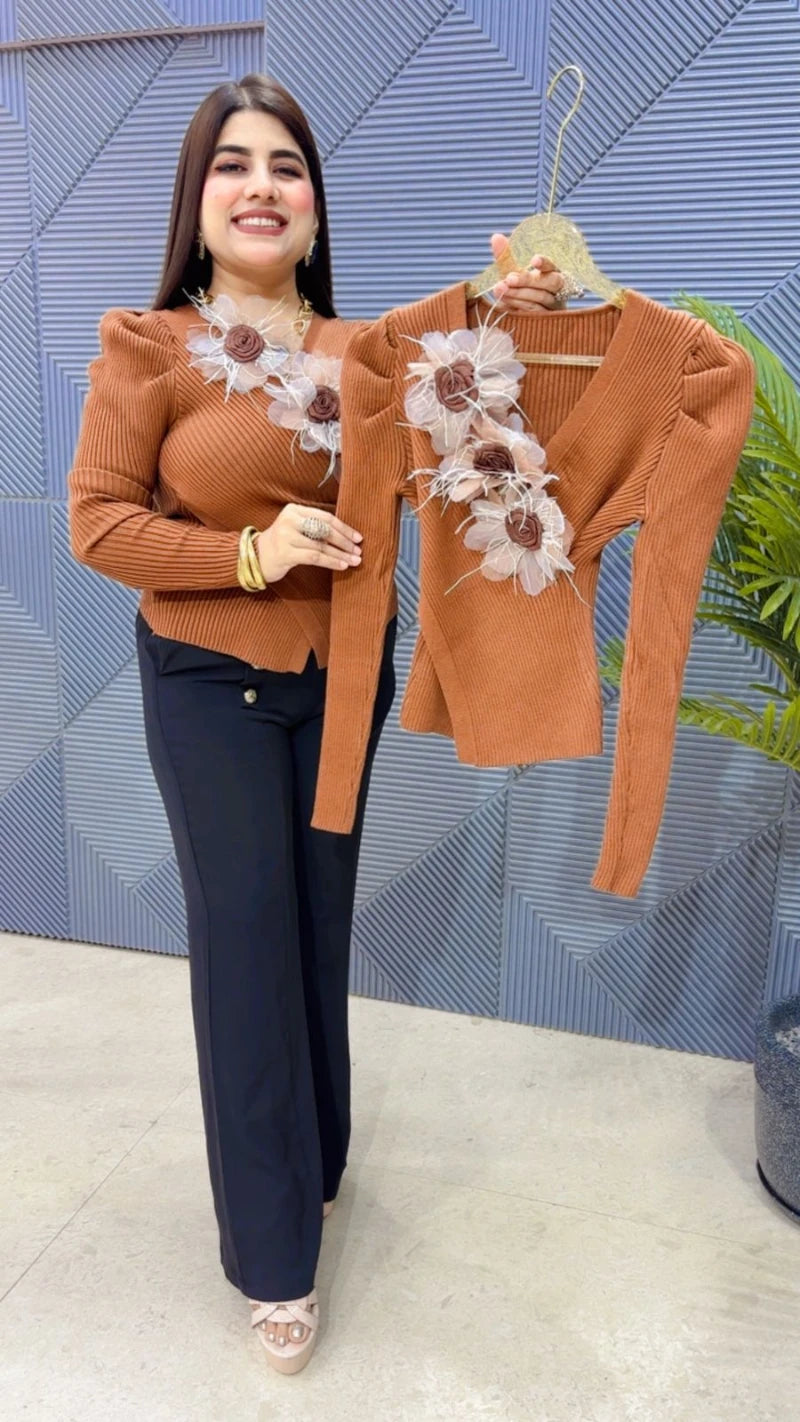 This BEAUTIFUL WOOLEN NITTED FULL SLEEVS TOP WITH ATTACHABLE FLOWER (TOP LENGTH: 19-20) Approx is perfect for the season . The TOP beautifully to create a versatile and stylish outfit. your summer wardrobe with this luxurious addition, adding a touch of sparkle and charm to any occasion .