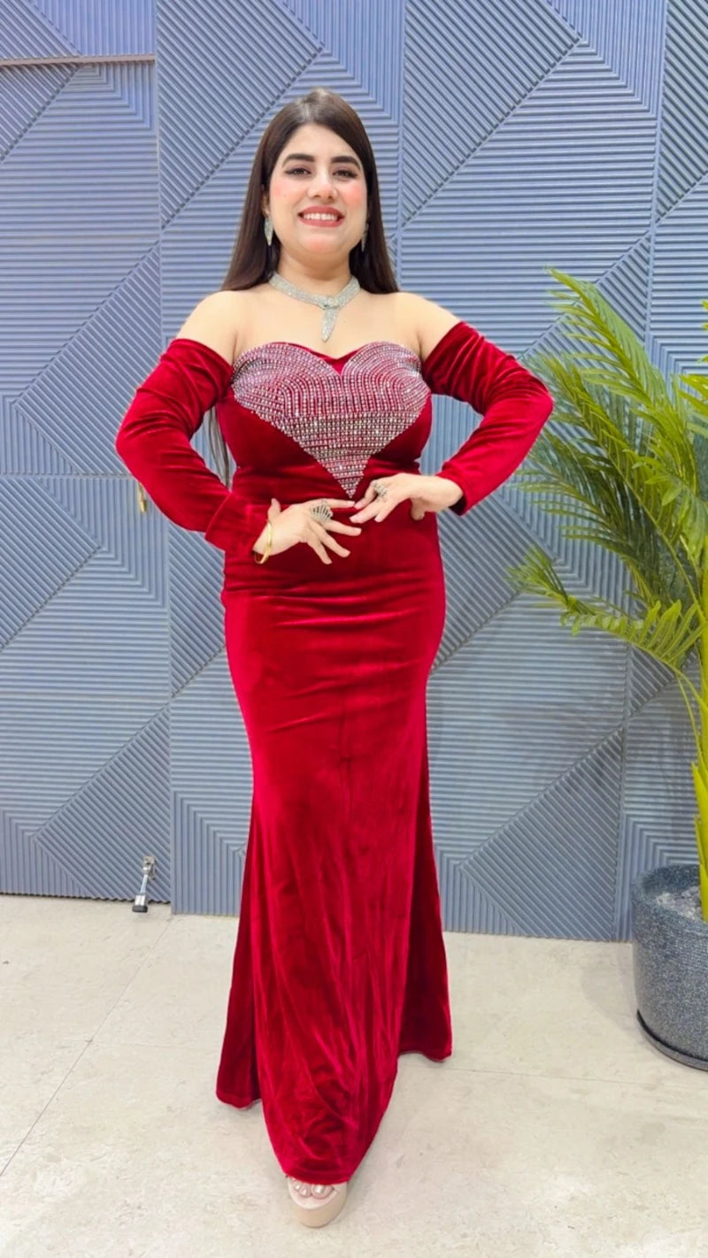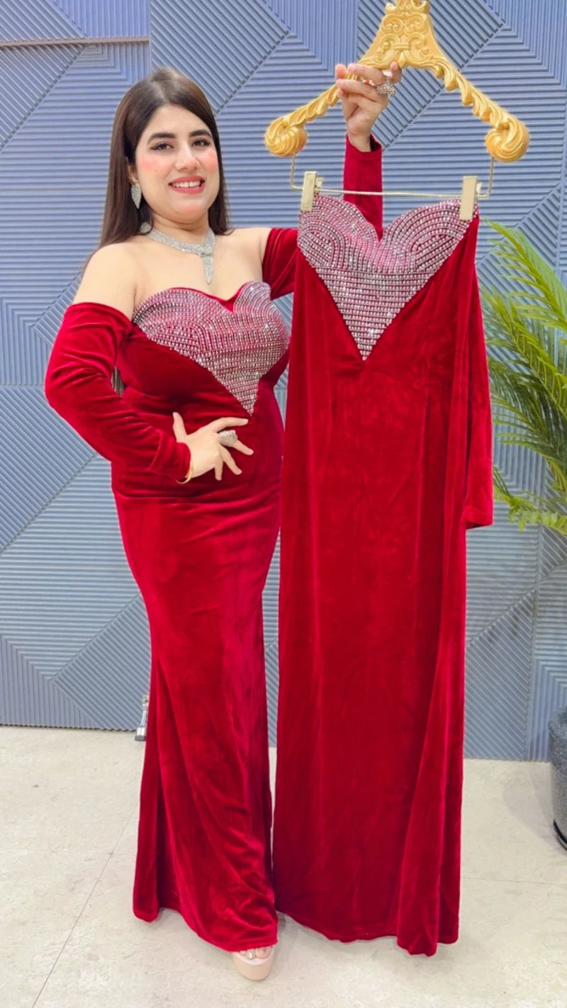 This BEAUTIFUL WINTER WEAR VELVET OFF SHOULDER TUBE HEART DRESS WITH SWROVSKI WORK AND FULL SLEEVS FOR PARTY,FUNCTIONS (LENGTH: 52-53) Approx is perfect for the season . The VELVET DRESS beautifully to create a versatile and stylish outfit. your summer wardrobe with this luxurious addition, adding a touch of sparkle and charm to any occasion.