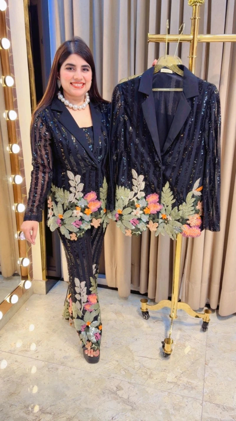 This BEAUTIFUL 3 PCS PARTYWEAR BLAZER SET FOR WINTER PRE-WINTER WITH SEQUENCE WORK, LASER CUT WORK, EMBROIDERY WORK (BUSTIER LENGTH: 15-16, BLAZER LENGTH: 30-31, BOTTOM LENGTH: 39-40) Approx is perfect for the season . The BLAZER SET beautifully to create a versatile and stylish outfit. your WINTER wardrobe with this luxurious addition, adding a touch of sparkle and charm to any occasion. ( DELIVERY DAYS WITHIN: 10-12 DAYS)