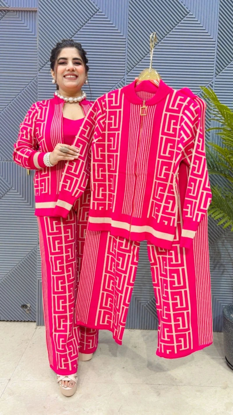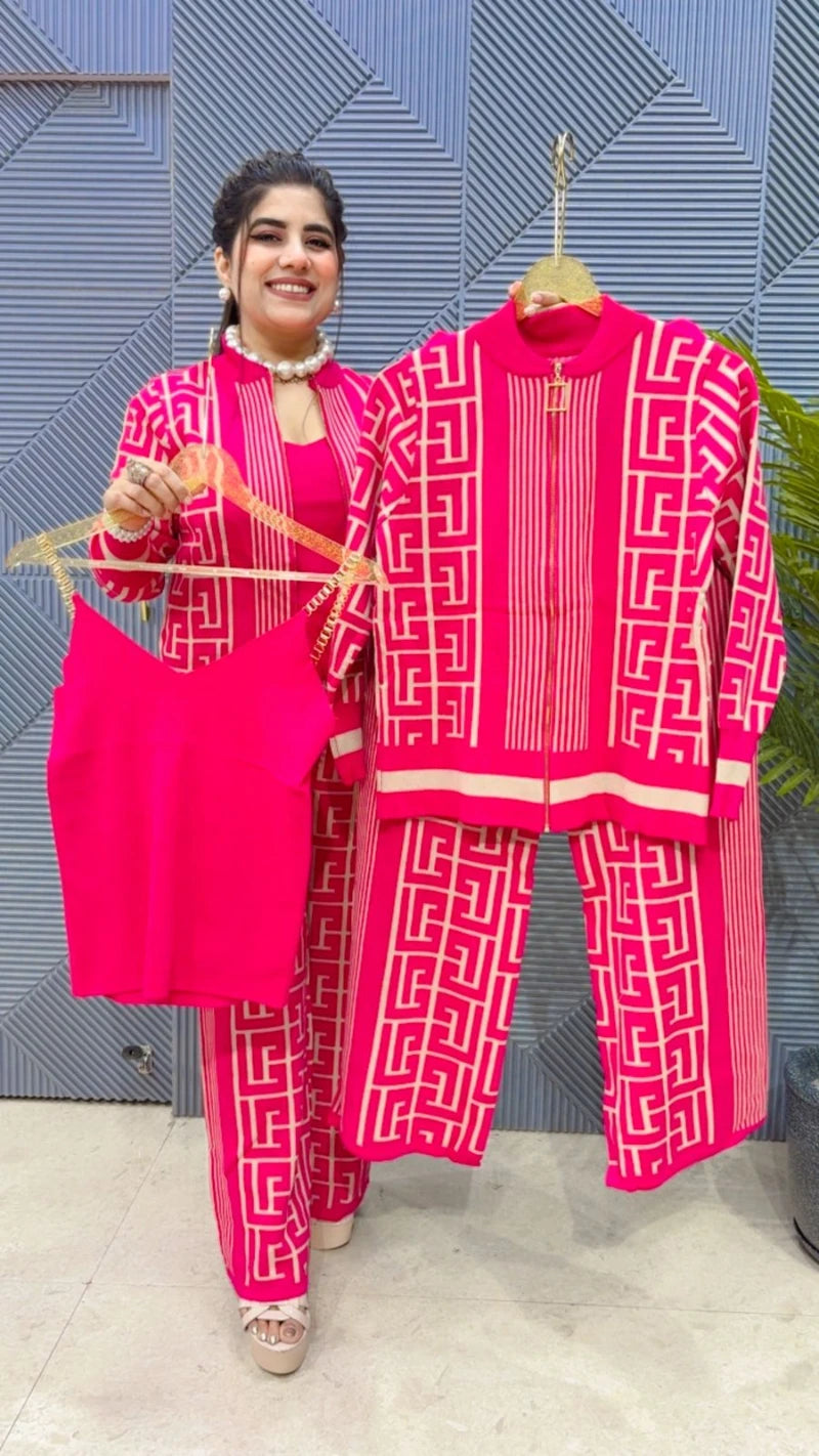 This BEAUTIFUL WINTER WEAR 3 PCS CORD SET (BUSTIER LENGTH: 21-22, JECKET LENGTH: 23-24, BOTTOM LENGTH: 38-39) Approx is perfect for the season . The CORD SET beautifully to create a versatile and stylish outfit. your summer wardrobe with this luxurious addition, adding a touch of sparkle and charm to any occasion.