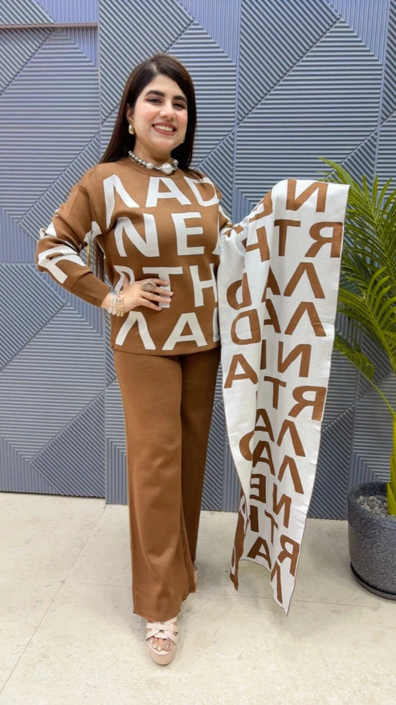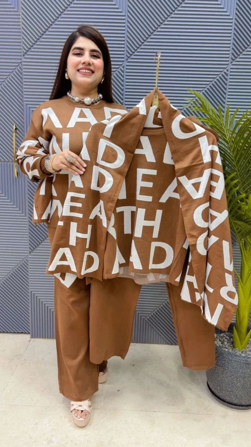 This BEAUTIFUL WINTERWEAR 3 PCS WOOLEN CORDSET WITH STOLE (TOP LENGTH: 25, BOTTOM LENGTH: 41) Approx is perfect for the season . The CORDSET beautifully to create a versatile and stylish outfit. your WINTER wardrobe with this luxurious addition, adding a touch of sparkle and charm to any occasion.
