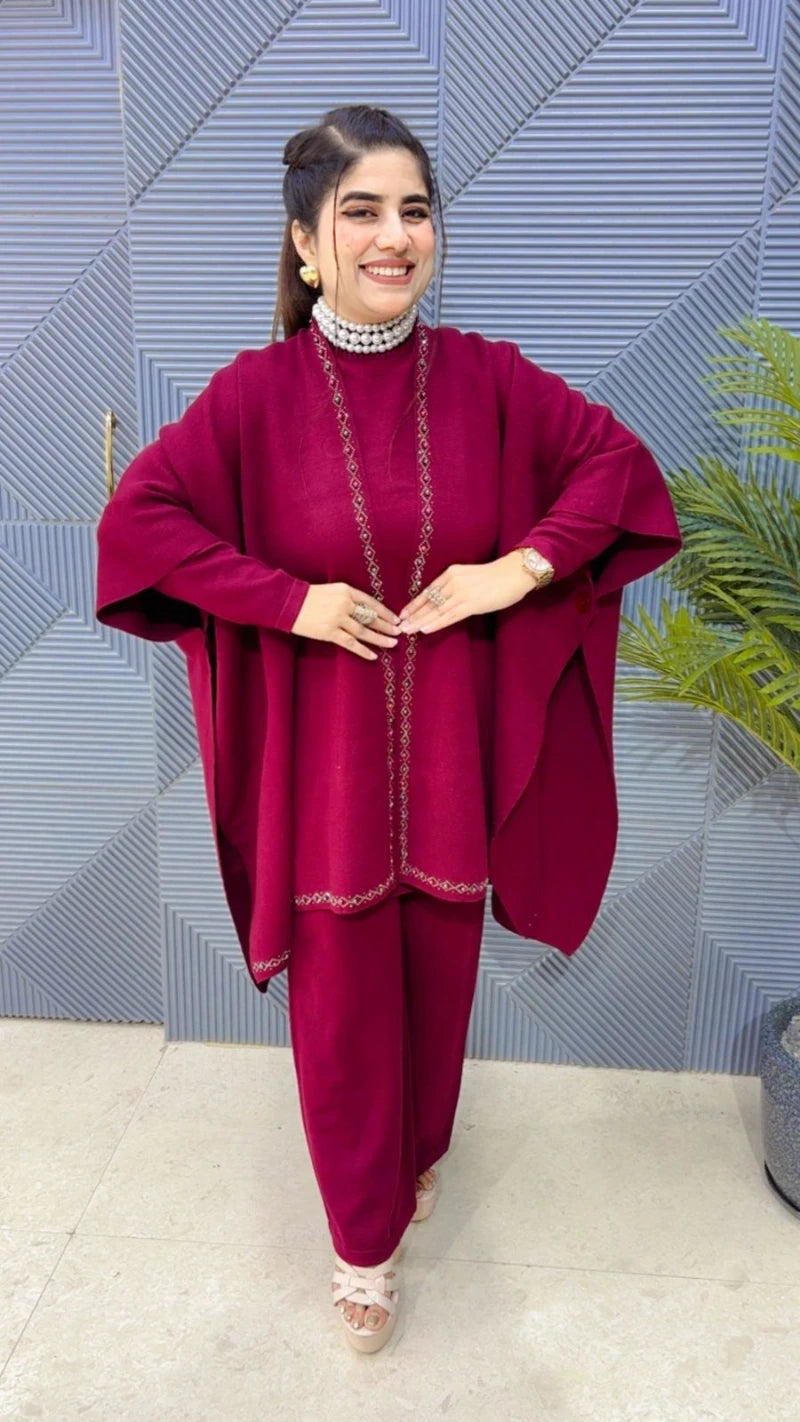 This BEAUTIFUL WINTERWEAR 3 PCS CORDSET WITH SWAROVSKI WORK CAPE AND BROOCH (TOP LENGTH: 32-33, CAPE LENGTH: 37, BOTTOM LENGTH: 40) Approx is perfect for the season . The 3 PCS CORDSET beautifully to create a versatile and stylish outfit. your WINTER wardrobe with this luxurious addition, adding a touch of sparkle and charm to any occasion. ( DELIVERY DAYS WITHIN: 10-12 DAYS)