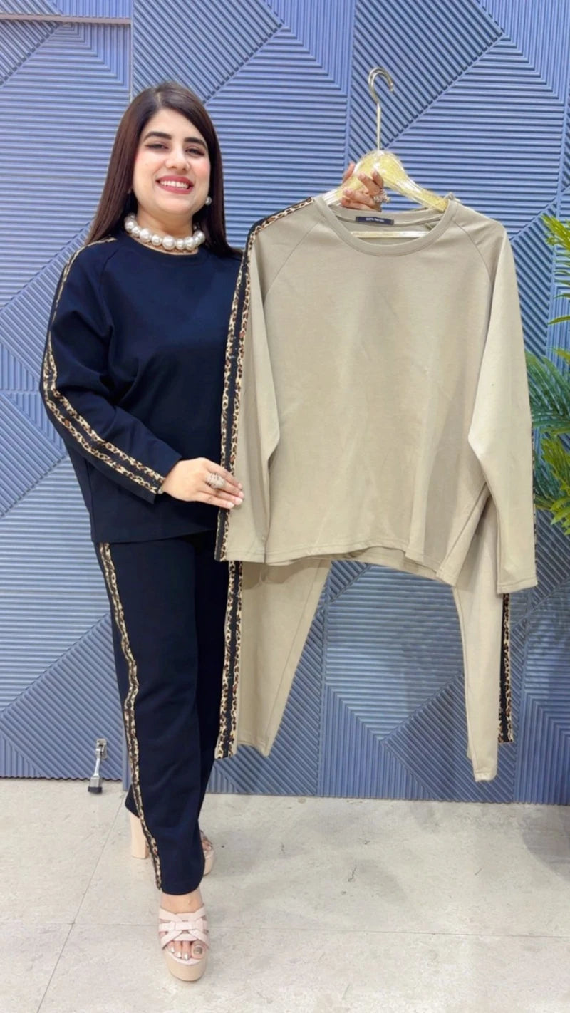This BEAUTIFUL CORD SET WITH LEOPERD PRINT SWAROVSKI WORK SIDE STRIPE ON CORD SET (TOP LENGTH: 25-26, BOTTOM LENGTH: 41) Approx is perfect for the season . The CORD SET beautifully to create a versatile and stylish outfit. your WINTER wardrobe with this luxurious addition, adding a touch of sparkle and charm to any occasion.