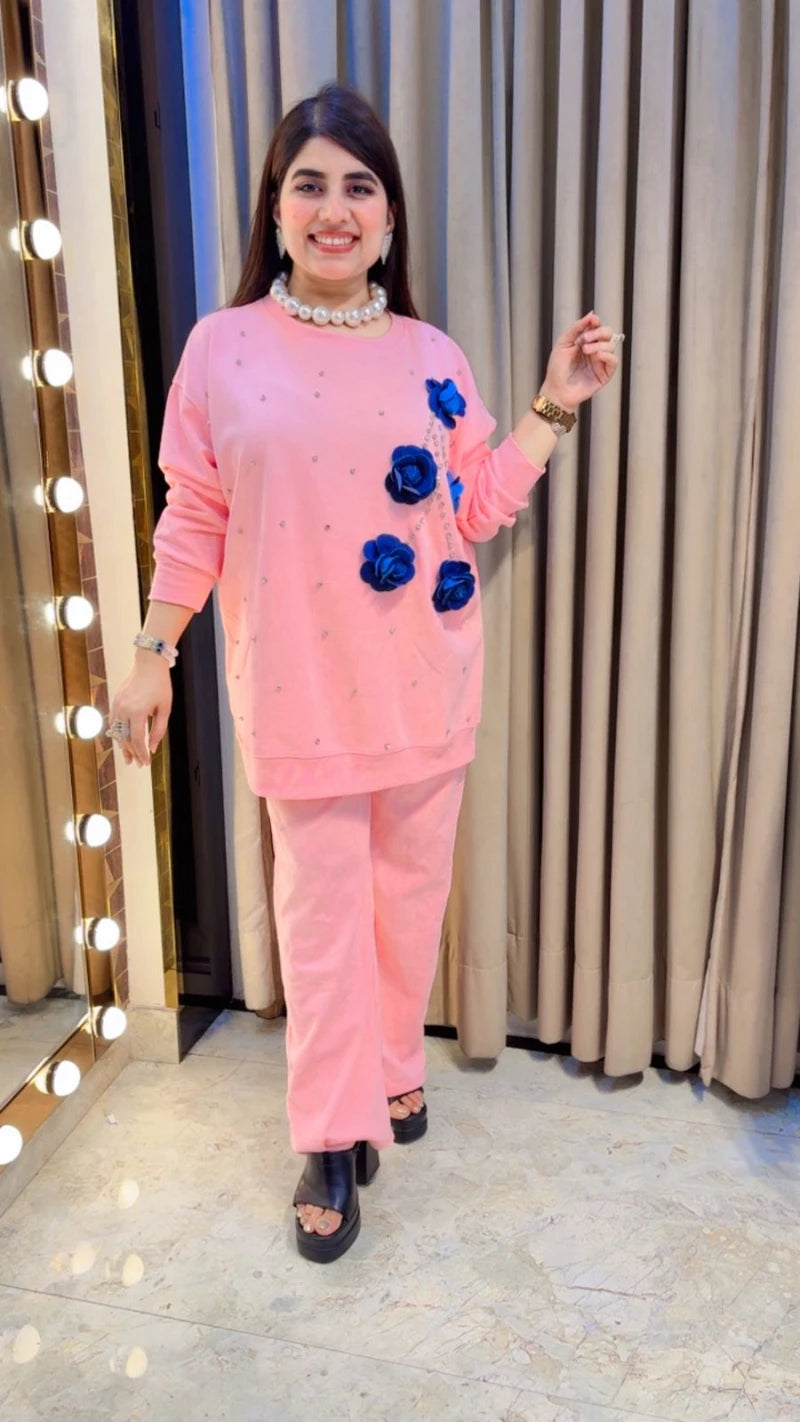 This BEAUTIFUL WINTERWEAR CORDSET WITH STUDED WORK AND 3D FLOWER WORK (TOP LENGTH: 29-30, BOTTOM LENGTH: 39-40) Approx is perfect for the season . The CORD SET beautifully to create a versatile and stylish outfit. your WINTER wardrobe with this luxurious addition, adding a touch of sparkle and charm to any occasion. ( DELIVERY DAYS WITHIN: 10-12 DAYS)