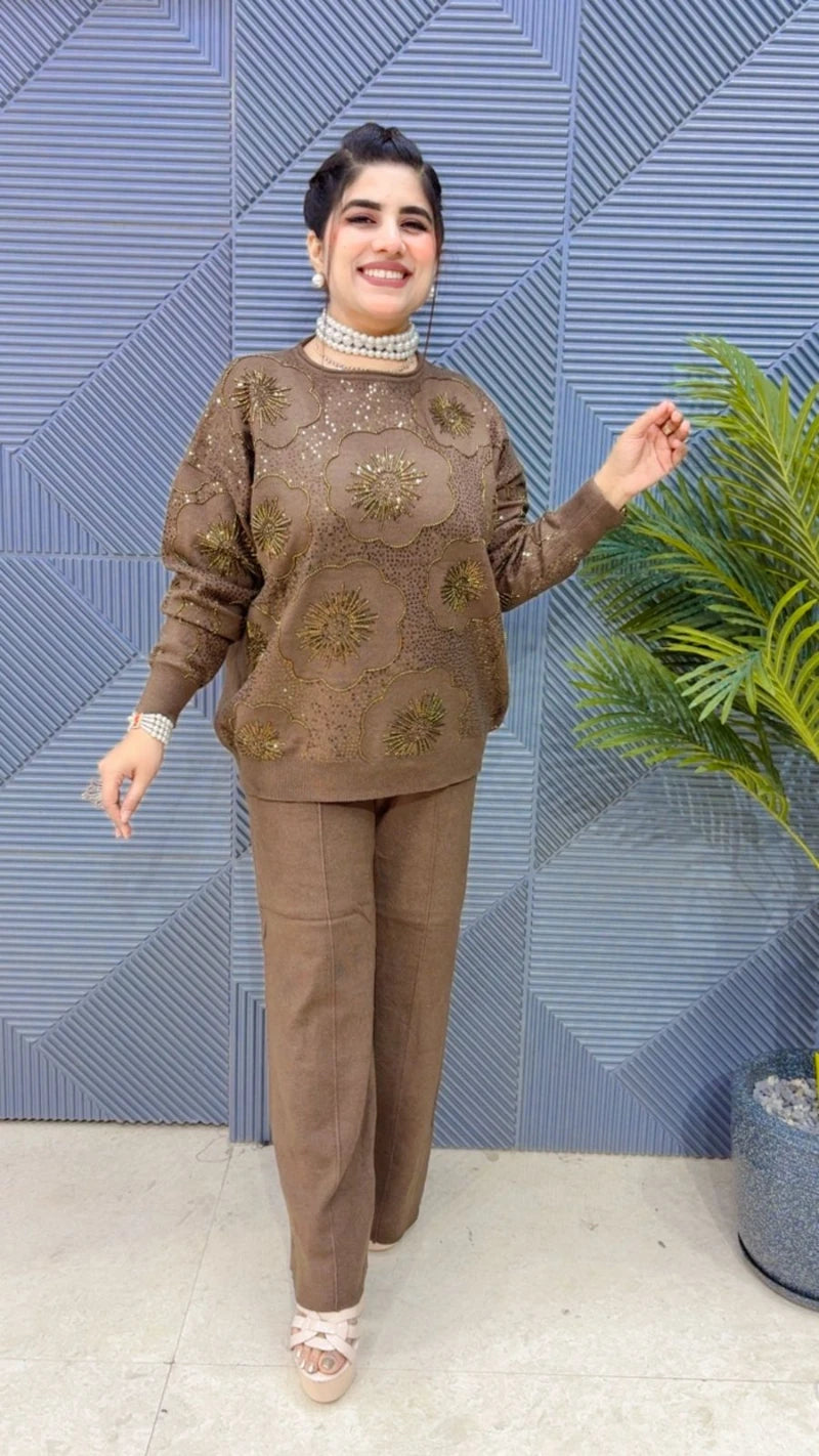 This BEAUTIFUL WINTERWEAR CORDSET WITH CUT DANA WORK AND KNITTED FEBRIC (TOP LENGTH:27-28, BOTTOM LENGTH: 41-42) Approx is perfect for the season . The CORDSET beautifully to create a versatile and stylish outfit. your WINTER wardrobe with this luxurious addition, adding a touch of sparkle and charm to any occasion. ( DELIVERY DAYS WITHIN: 10-12 DAYS)