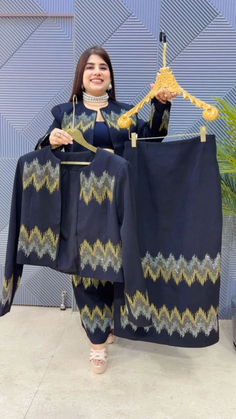 This BEAUTIFUL PARTYWEAR SKIRT BLAZER SET WITH SWAROVSKI WORK (LENGTH: 21-22, SKIRT LENGTH: 37-38) Approx is perfect for the season . The SKIRT BLAZER SET beautifully to create a versatile and stylish outfit. your WINTER wardrobe with this luxurious addition, adding a touch of sparkle and charm to any occasion.