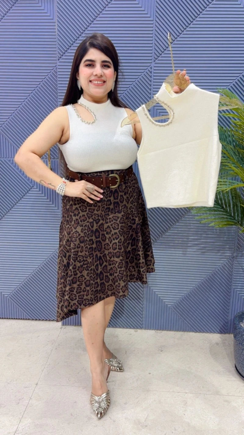 This BEAUTIFUL WINTERWEAR TOP WITH BEAUTIFUL LASERCUT NECK DESIGN AND STUDED WORK ON NECK AND KNIT FEBRIC (LENGTH:18-19) Approx is perfect for the season . The TOP beautifully to create a versatile and stylish outfit. your WINTER wardrobe with this luxurious addition, adding a touch of sparkle and charm to any occasion.